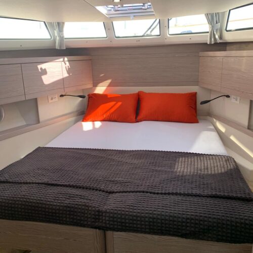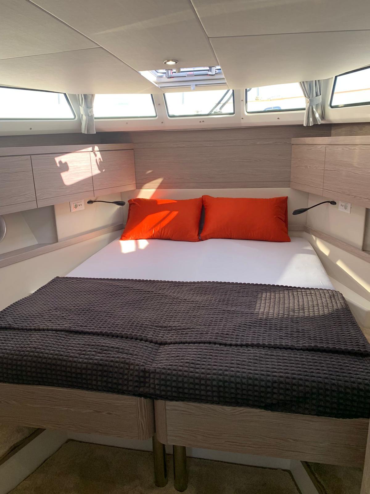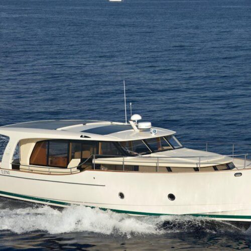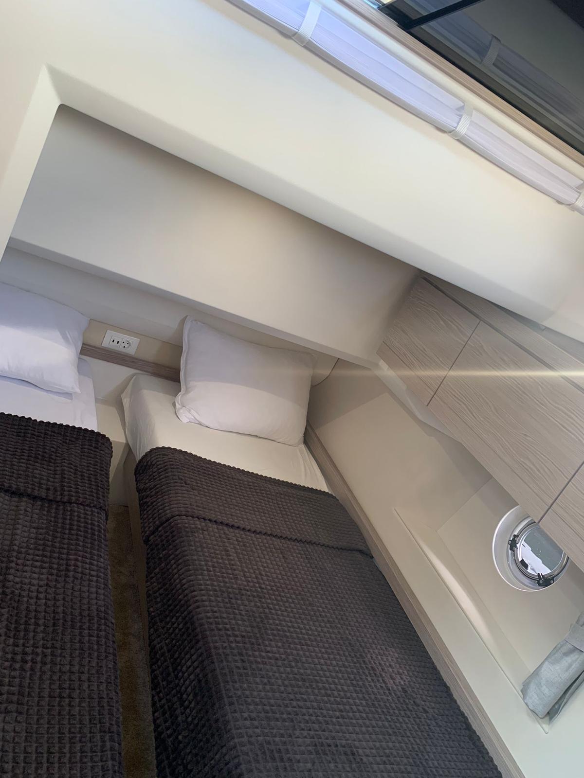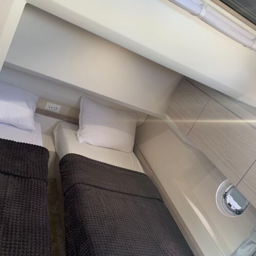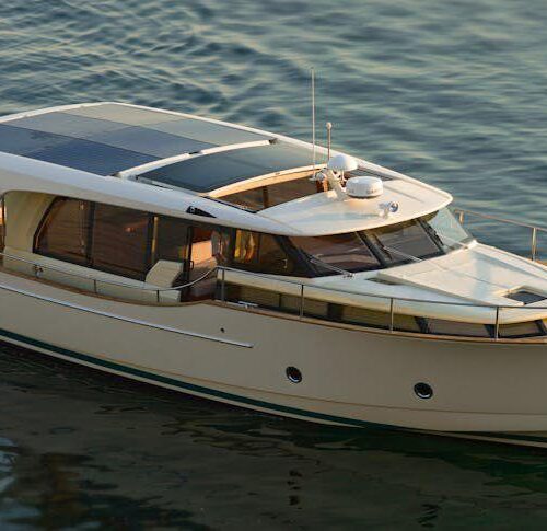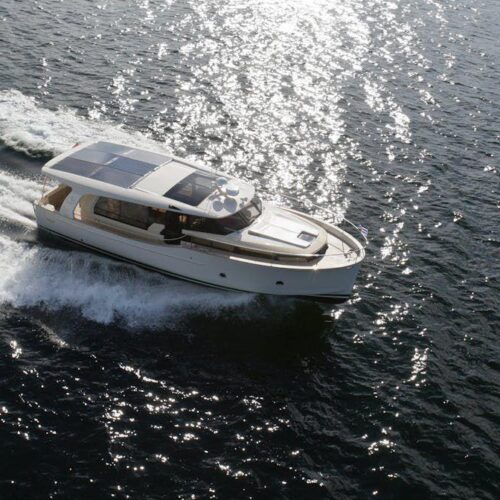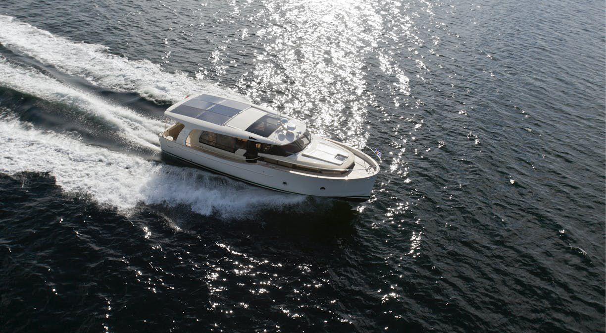 Greenline 40, çift dizel motor ve gece boyunca tüm sistemleri destekleyen lityum batarya bankası ile donatılmış, ayrıca ekonomik şarj için güneş panellerine sahip 2 kabinli bir modeldir.