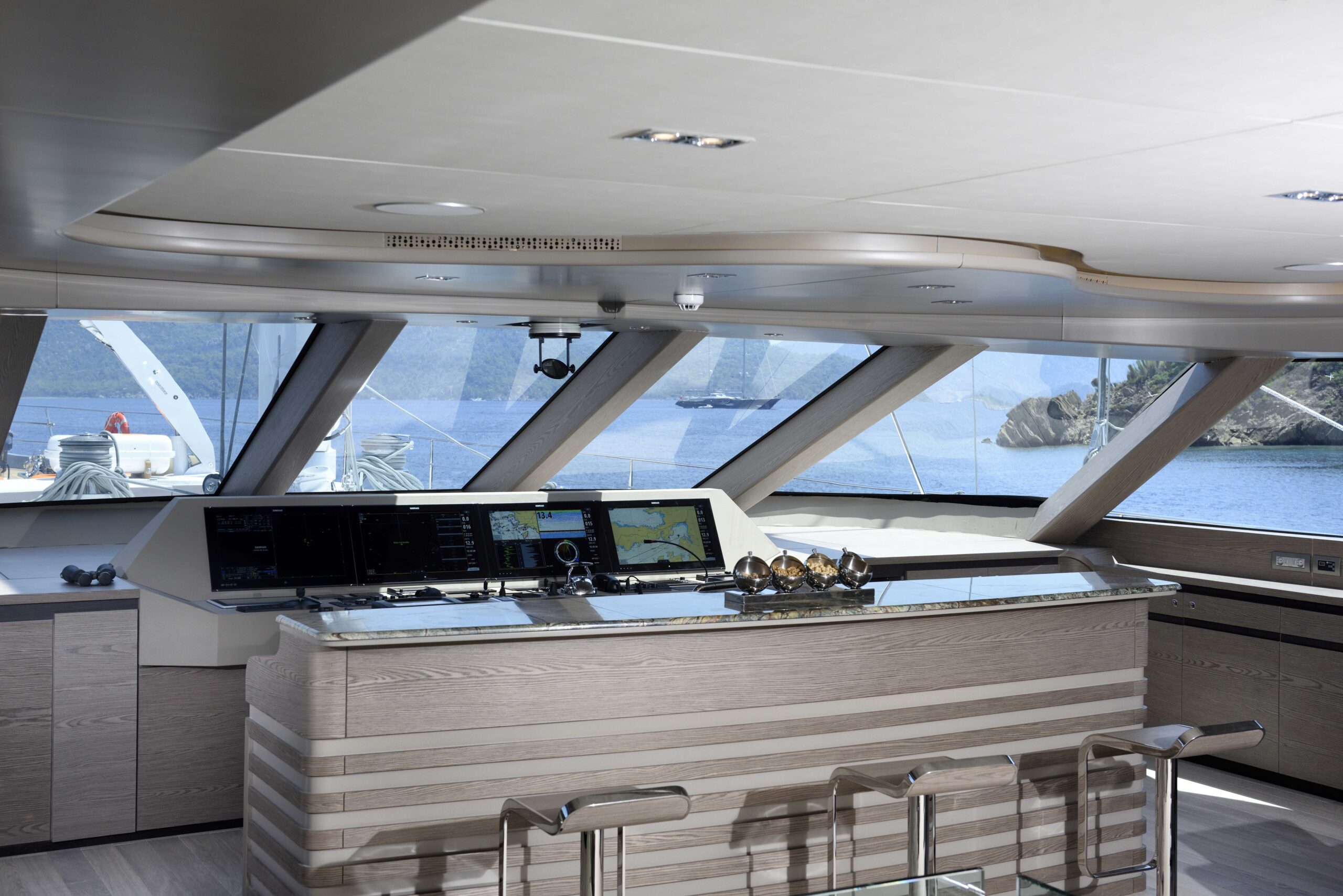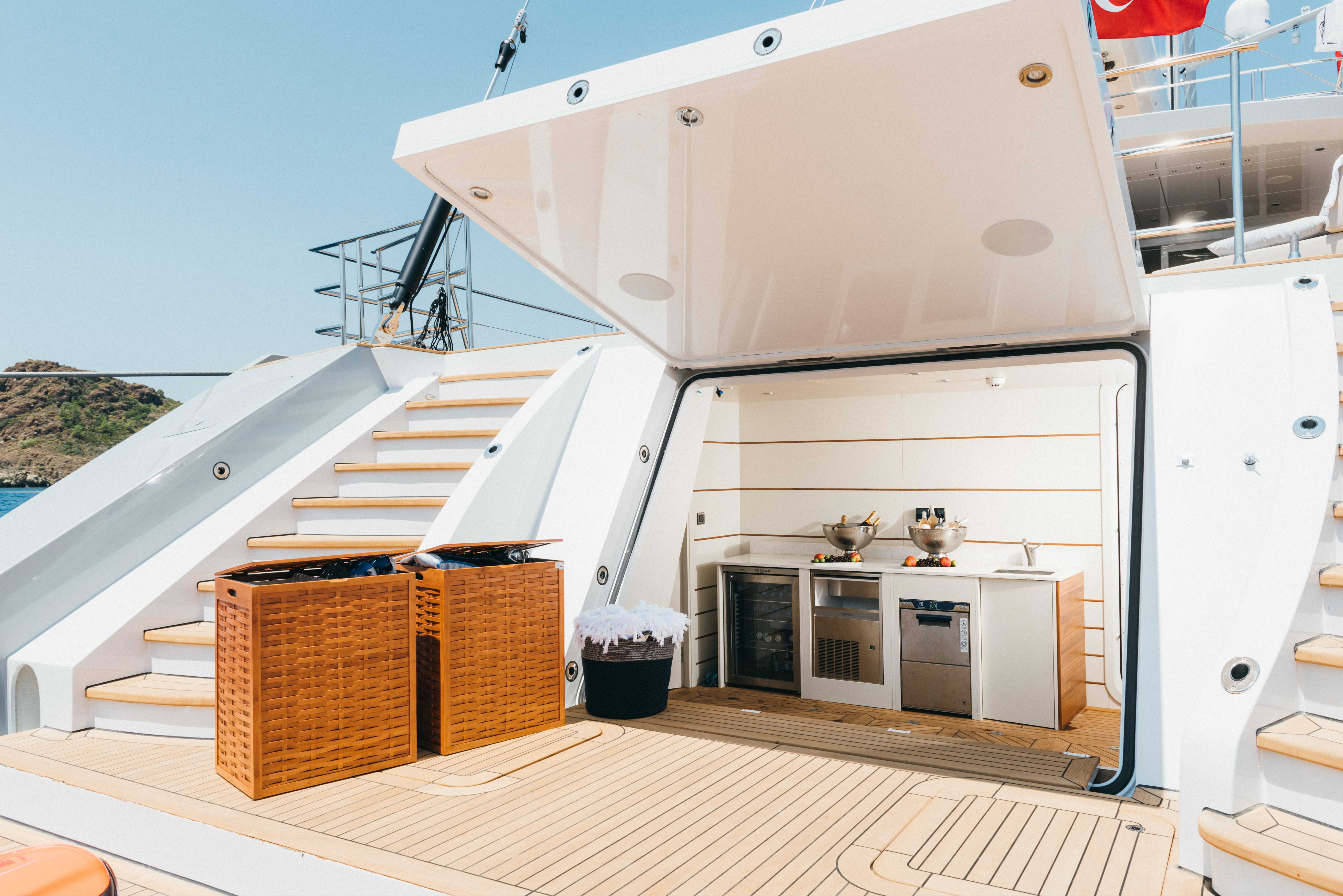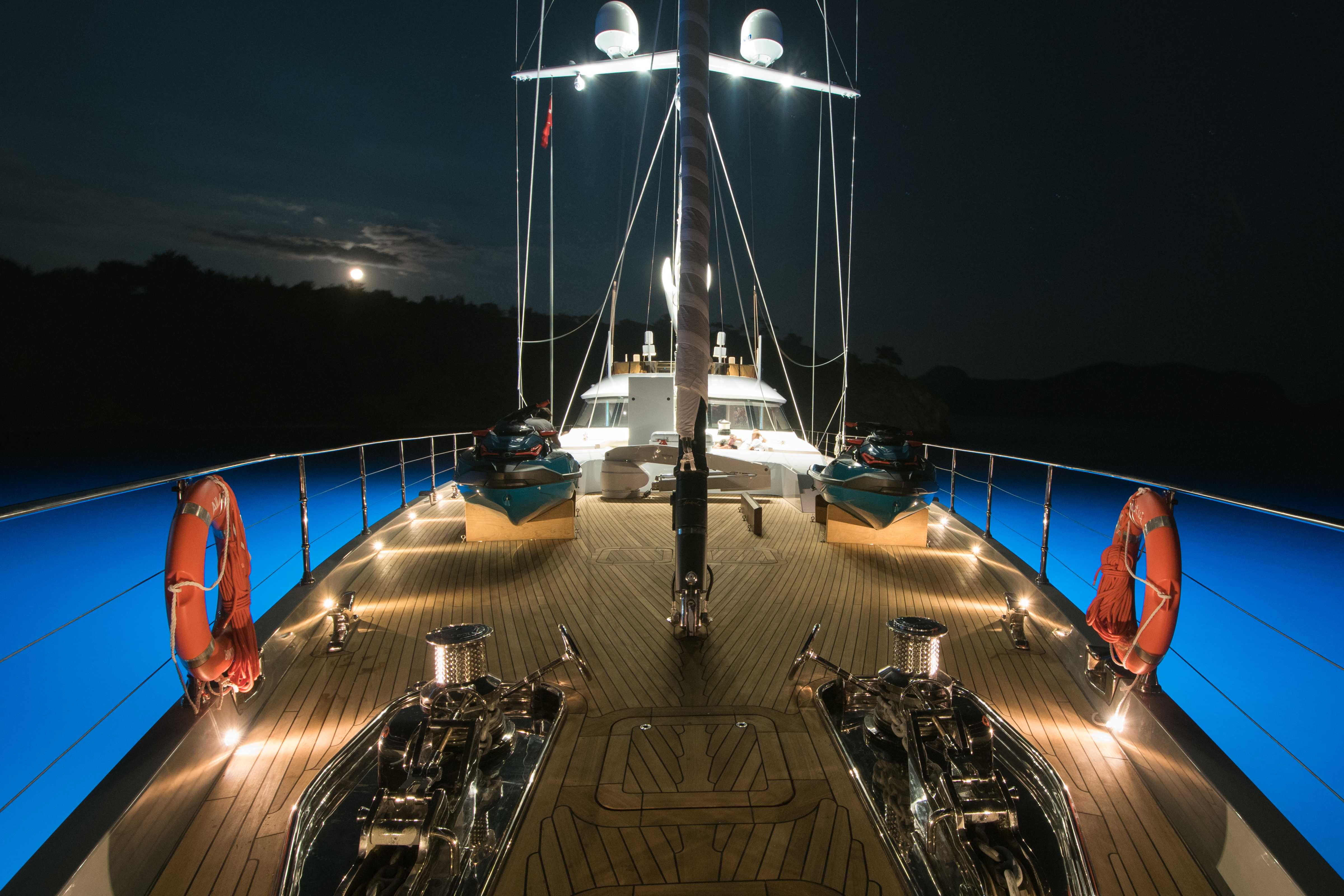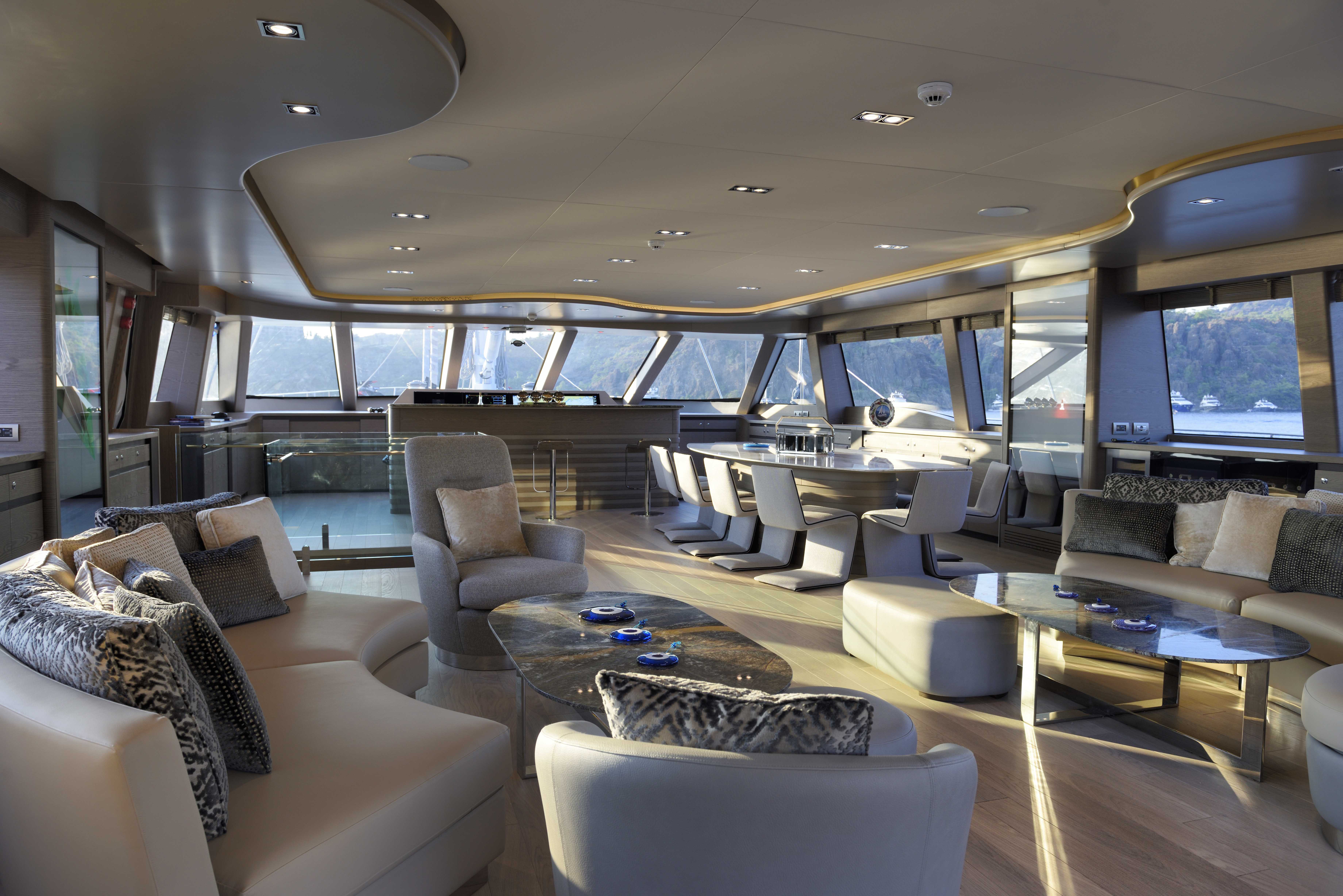 Lüks mavi yolculuk standartlarını üst seviyeye taşıyan yatımızın geniş üst yaşam alanında; tam donanımlı bir bar, rahat güneşlenme alanları ve şık oturma grupları yer almaktadır. Bu özel bölüm, misafirlerimize gün batımı eşliğinde keyifli sohbetler, özel etkinlikler, müzik dinletileri ve unutulmaz davetler gerçekleştirebilme imkânı sunar.
