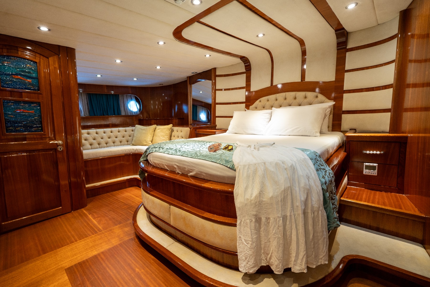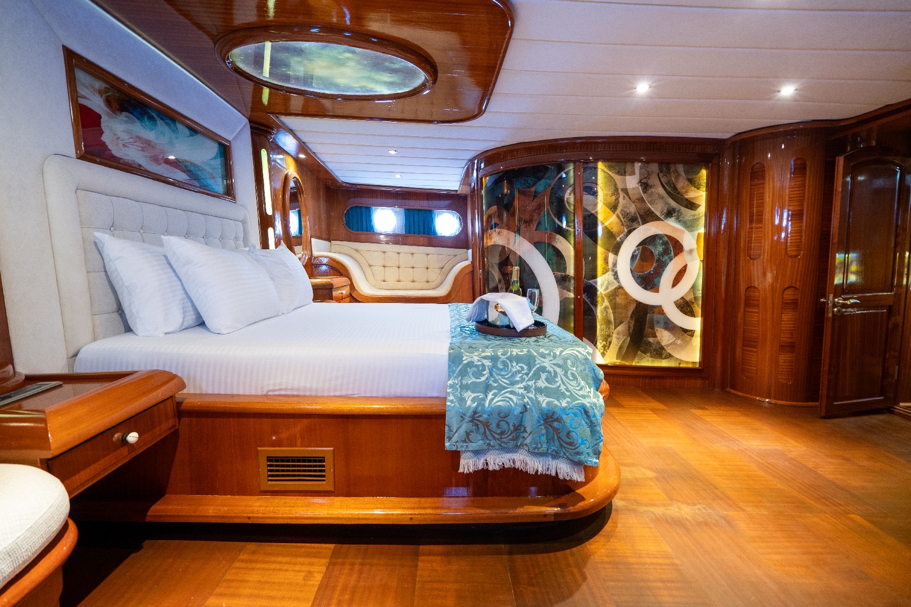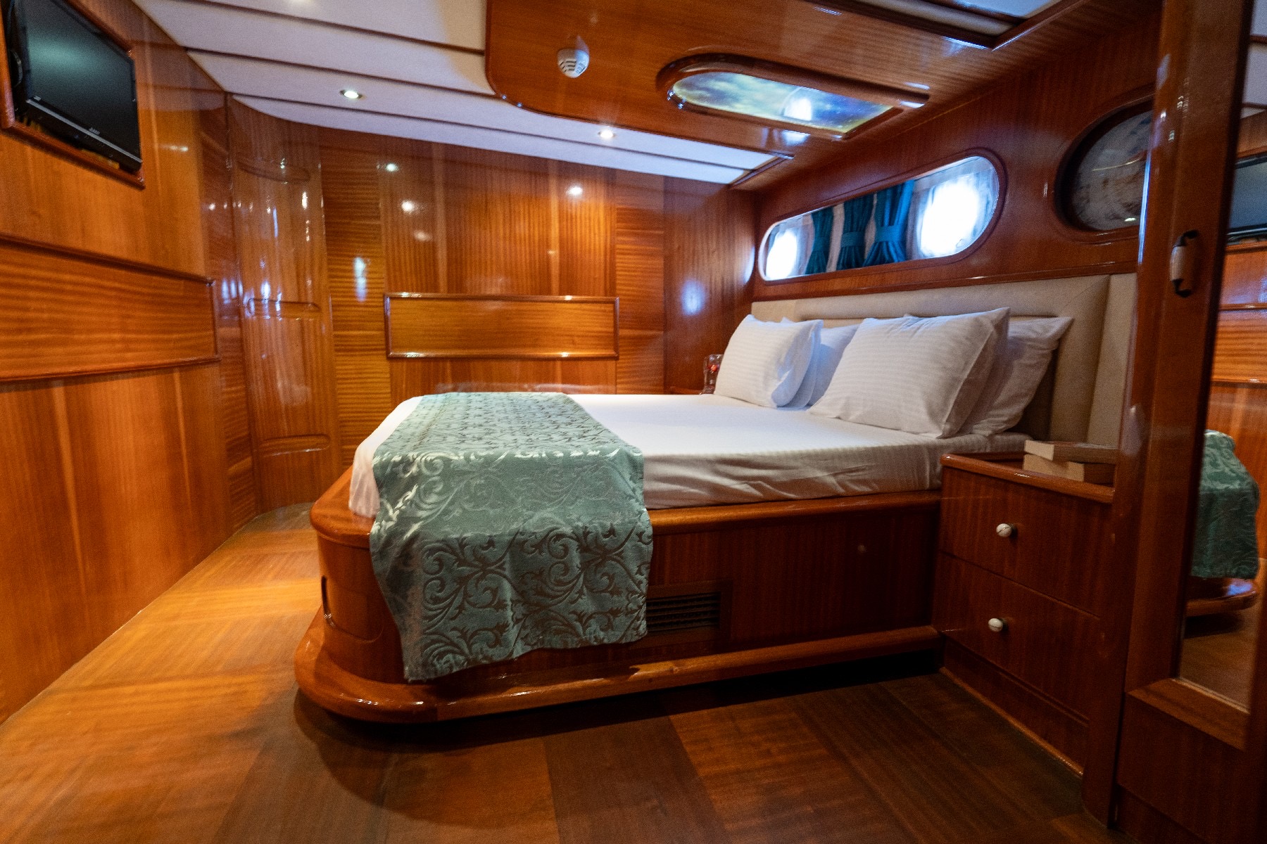 Toplam 12 misafir kapasiteli teknemizde, baş ve kıçta yer alan 2 master kabinin yanı sıra 4 standart çift kişilik kabin bulunmaktadır. Her kabin, misafirlerin konforu düşünülerek özenle tasarlanmış olup, rahat ve keyifli bir konaklama deneyimi sunar.