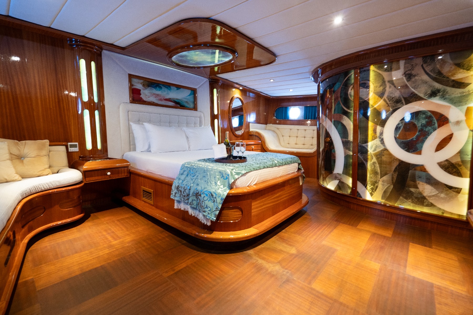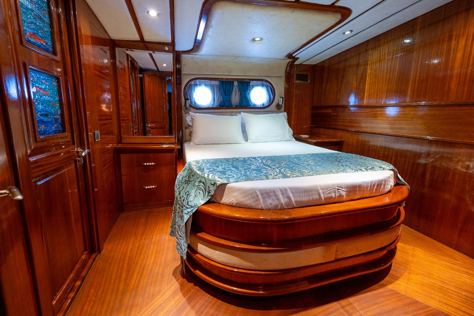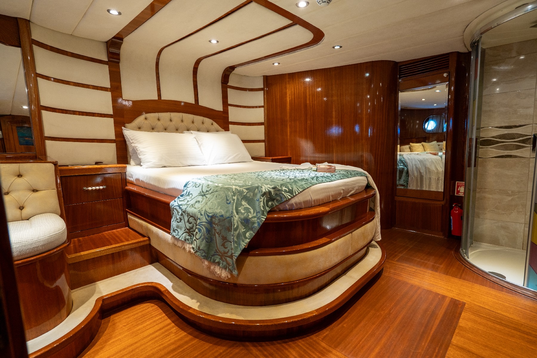 Toplam 12 misafir kapasiteli teknemizde, baş ve kıçta yer alan 2 master kabinin yanı sıra 4 standart çift kişilik kabin bulunmaktadır. Her kabin, misafirlerin konforu düşünülerek özenle tasarlanmış olup, rahat ve keyifli bir konaklama deneyimi sunar.