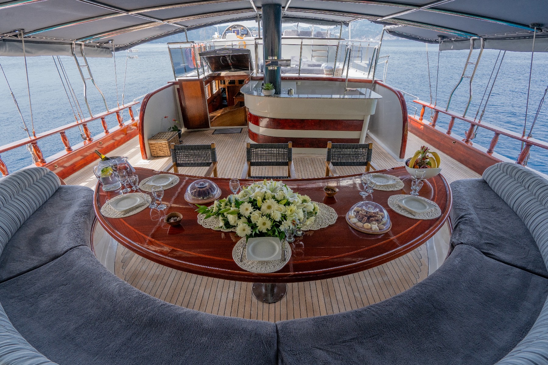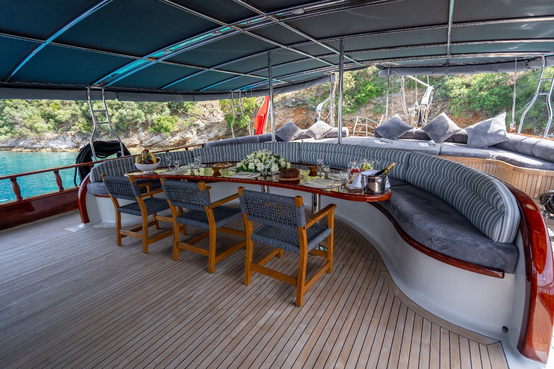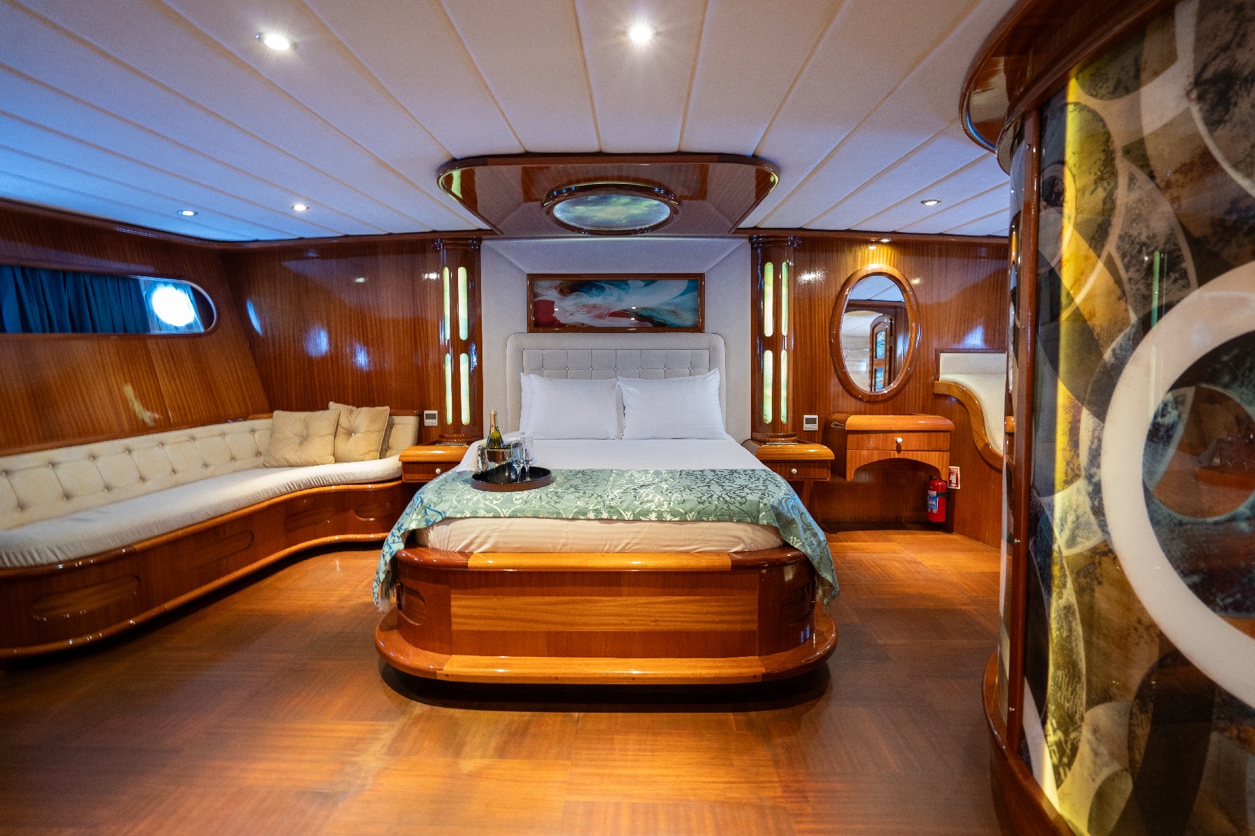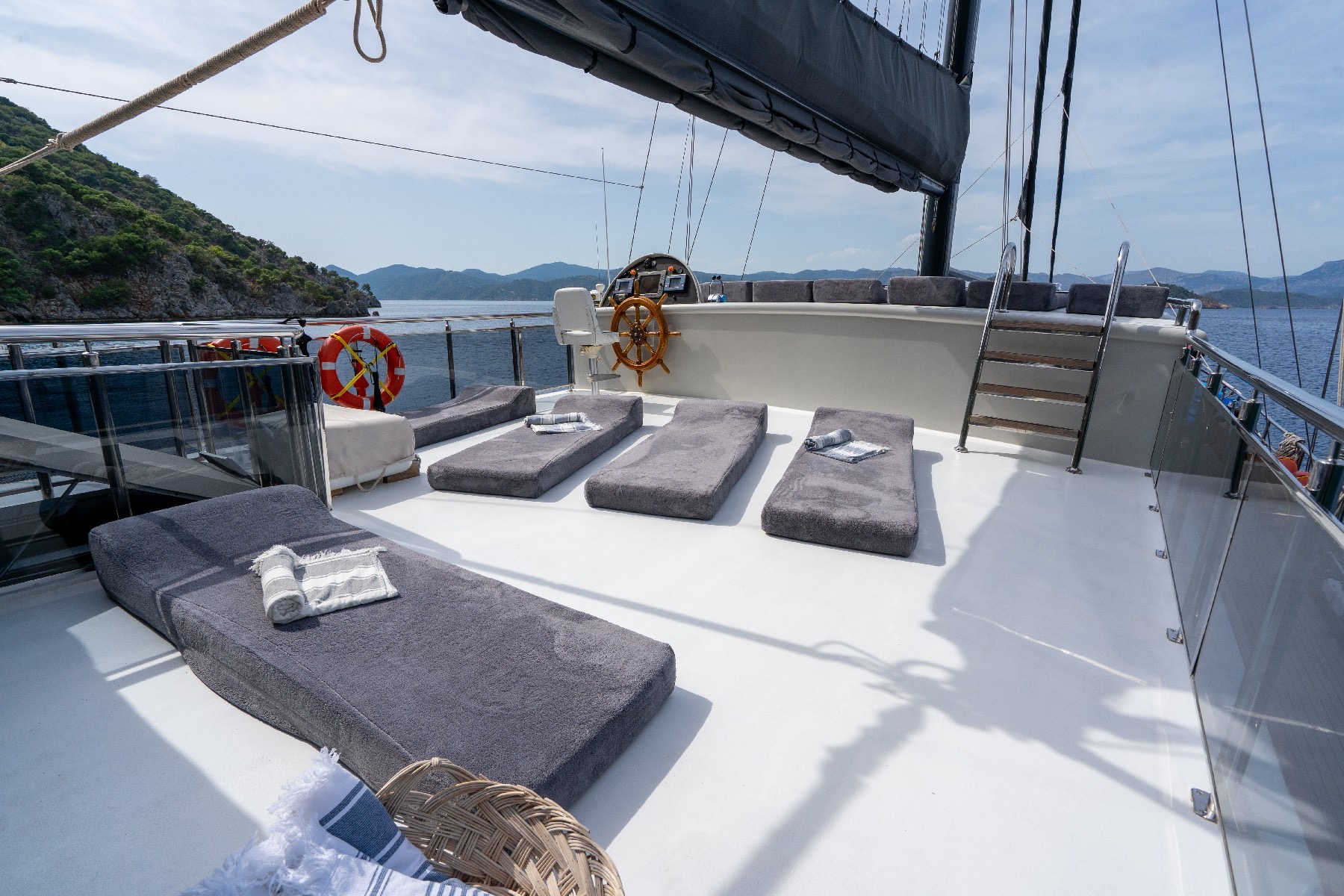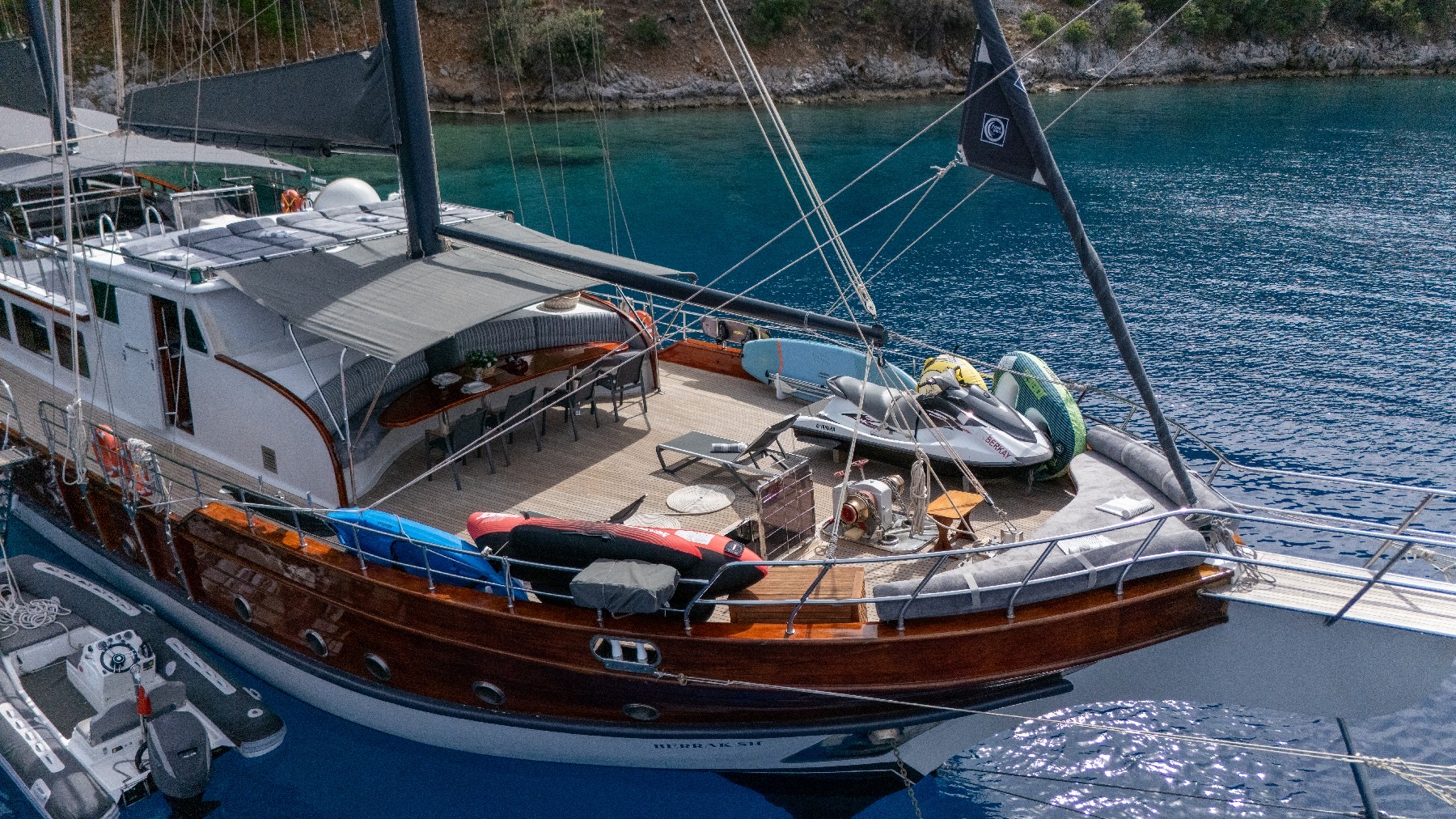 31 metre uzunluğundaki Berrak Su Gulet, 2019 yılında tamamen yenilenen iç yaşam alanıyla misafirlerine modern ve konforlu bir mavi yolculuk deneyimi sunmaktadır.