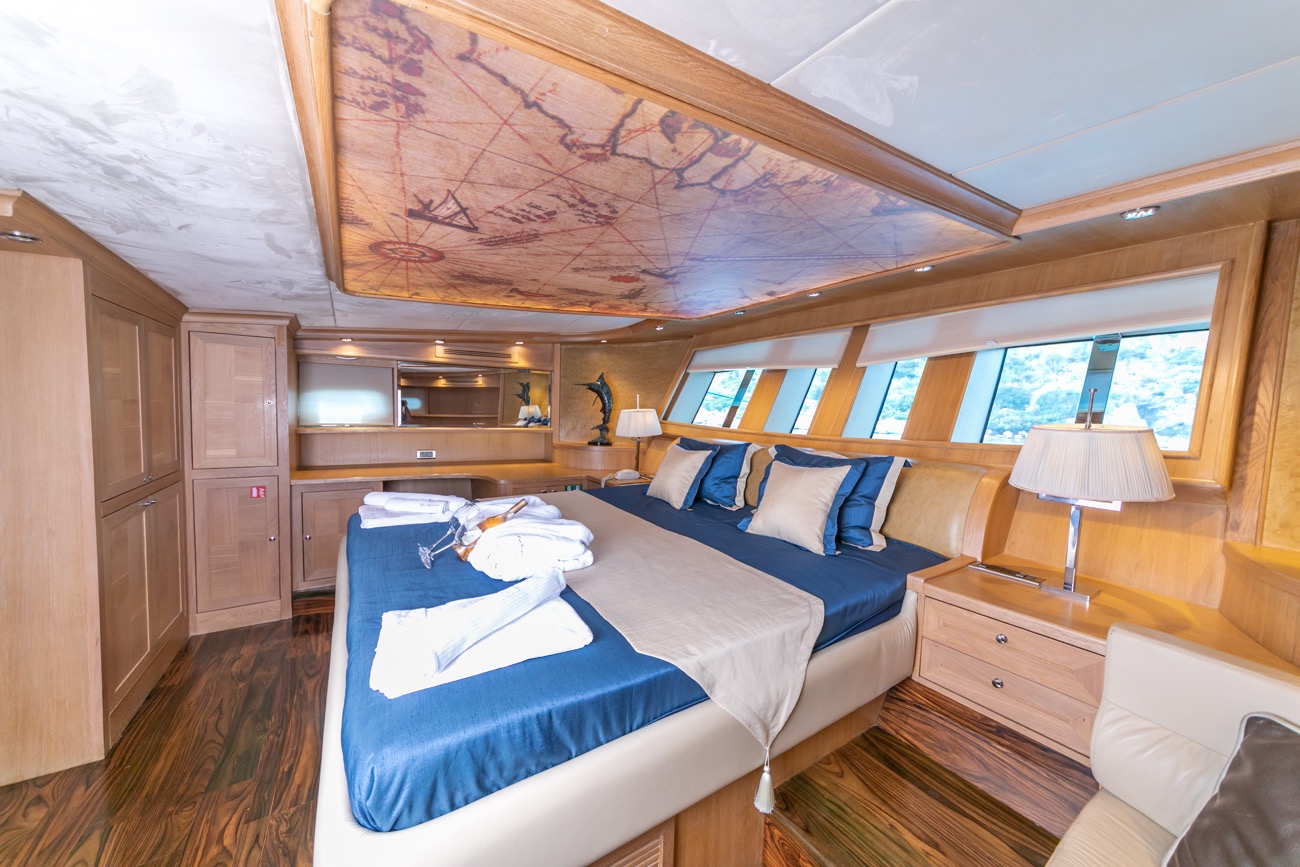 2 Master, 2 Twin ve 1 Single kabini ile 9 misafiri ağırlayabilen teknemizde, tüm kabinlerde TV, 24 saat hizmet veren klima ve özel ebeveyn banyosu mevcuttur. Master kabinlerinde jakuzi ve buhar banyosu bulunurken, ön güvertede ikinci bir jakuzi ile deniz manzarasının keyfini çıkarmak mümkündür. Klasik ve modern tasarım detaylarının bir araya geldiği teknemiz, üstün kalite ve konfor anlayışıyla unutulmaz bir mavi yolculuk deneyimi vaat etmektedir.