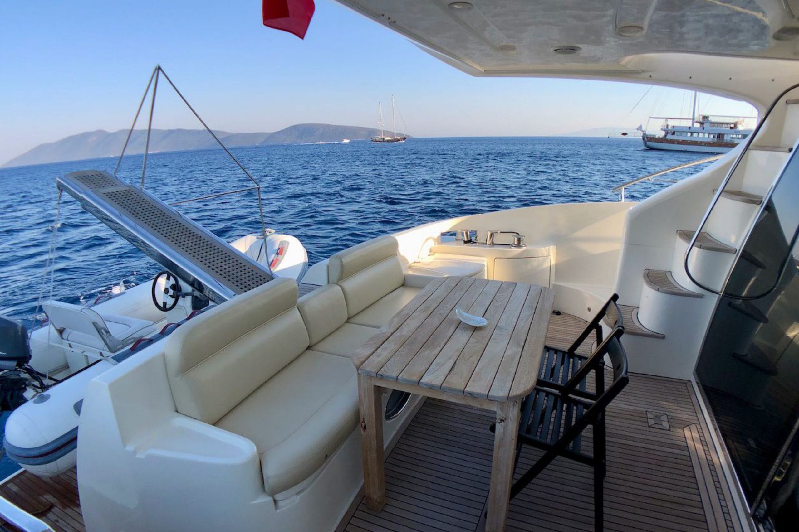 Geniş flybridge üst güvertesi, deniz manzarasını doyasıya yaşayabileceğiniz özel bir alan sunarken; deneyimli kaptan ve hostes eşliğindeki profesyonel hizmet, tatilinizin her anını keyifli ve sorunsuz hale getirir. Ücretsiz dingi motoru sayesinde kıyı keşifleri yapabilir, tam donanımlı ve fırınlı mutfakta hazırlanan yemeklerle gurme lezzetlerin tadına varabilirsiniz.