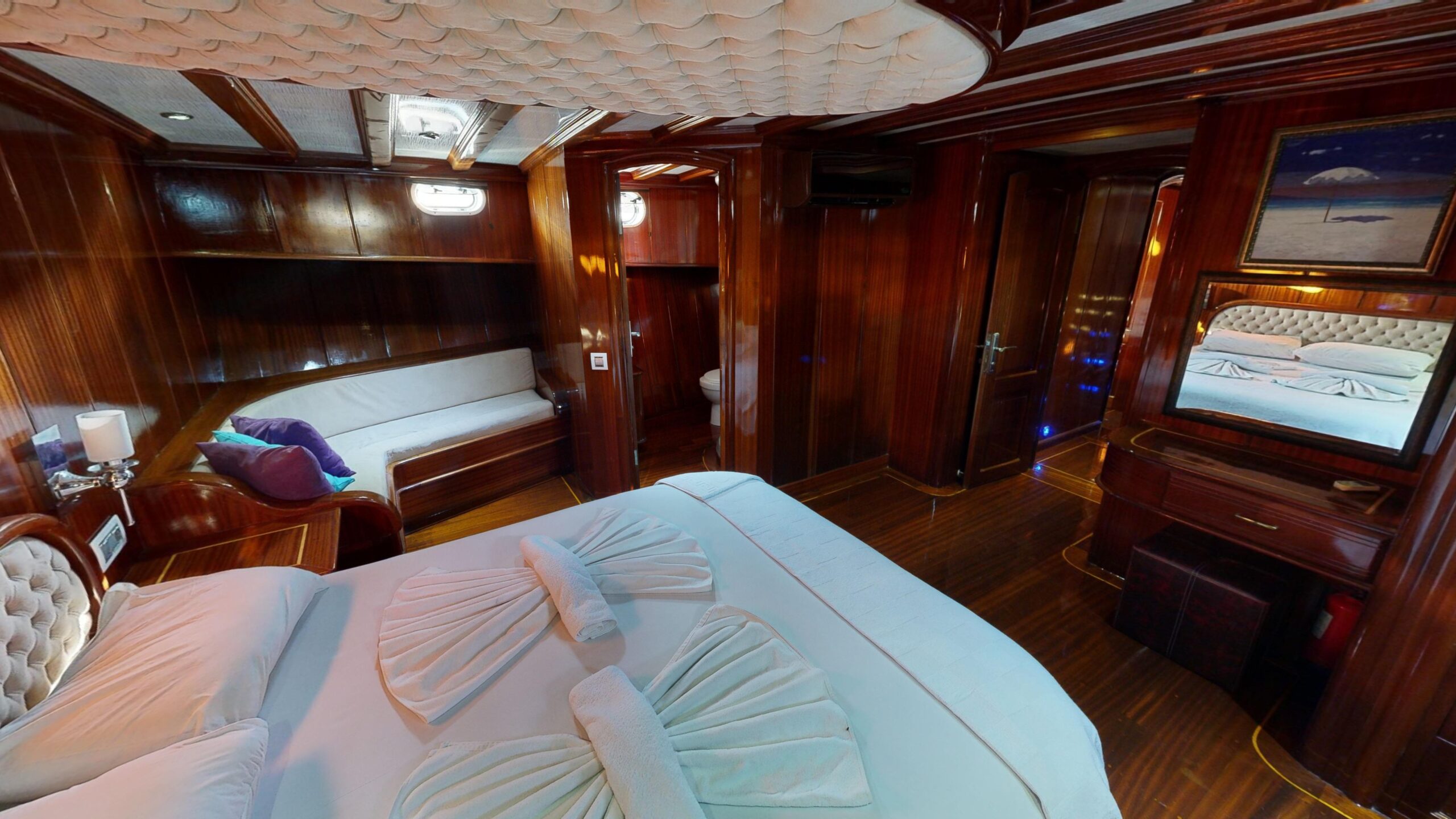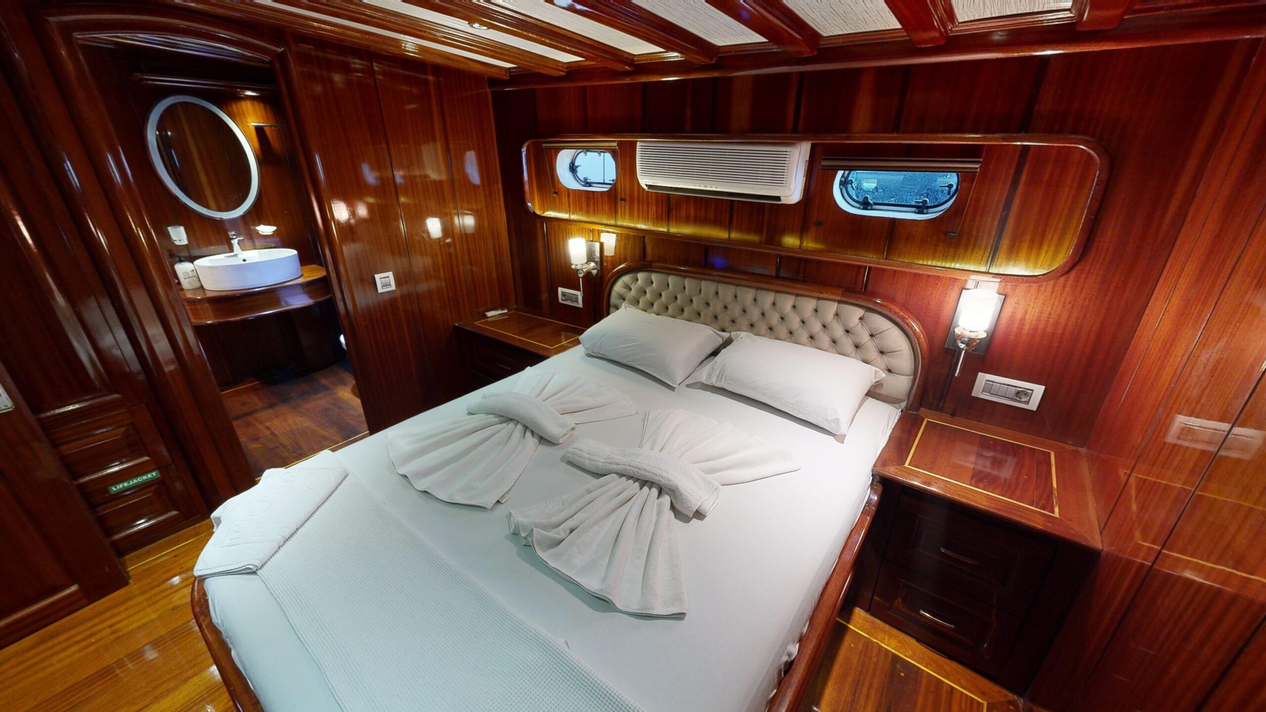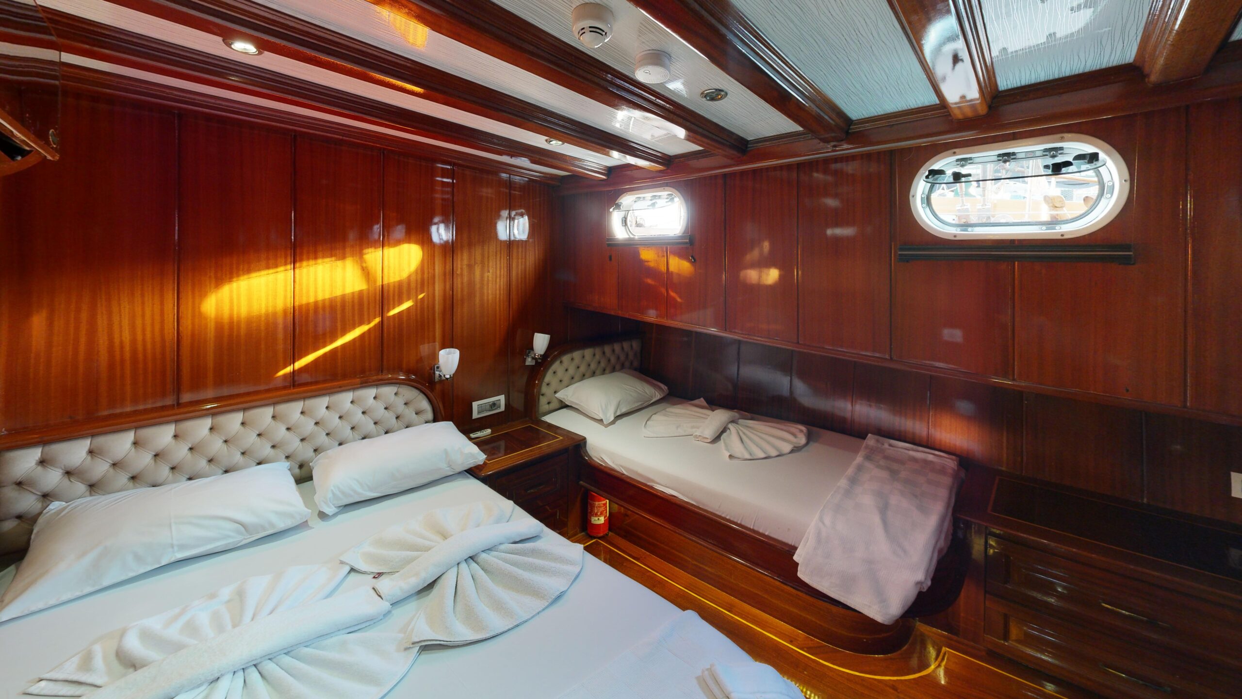 Teknemizde 2 master, 2 double ve 2 triple olmak üzere toplam 6 kabin bulunur. Her kabin, ebeveyn banyosu ve modern olanaklarıyla 12 kişiye kadar olan misafir gruplarına konforlu bir konaklama imkânı sağlar.