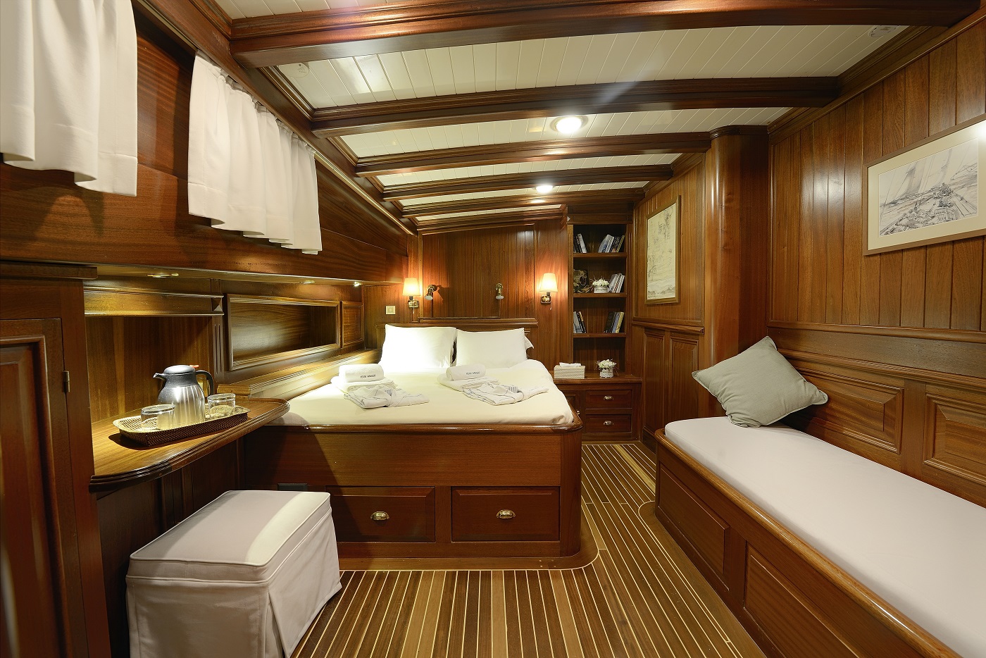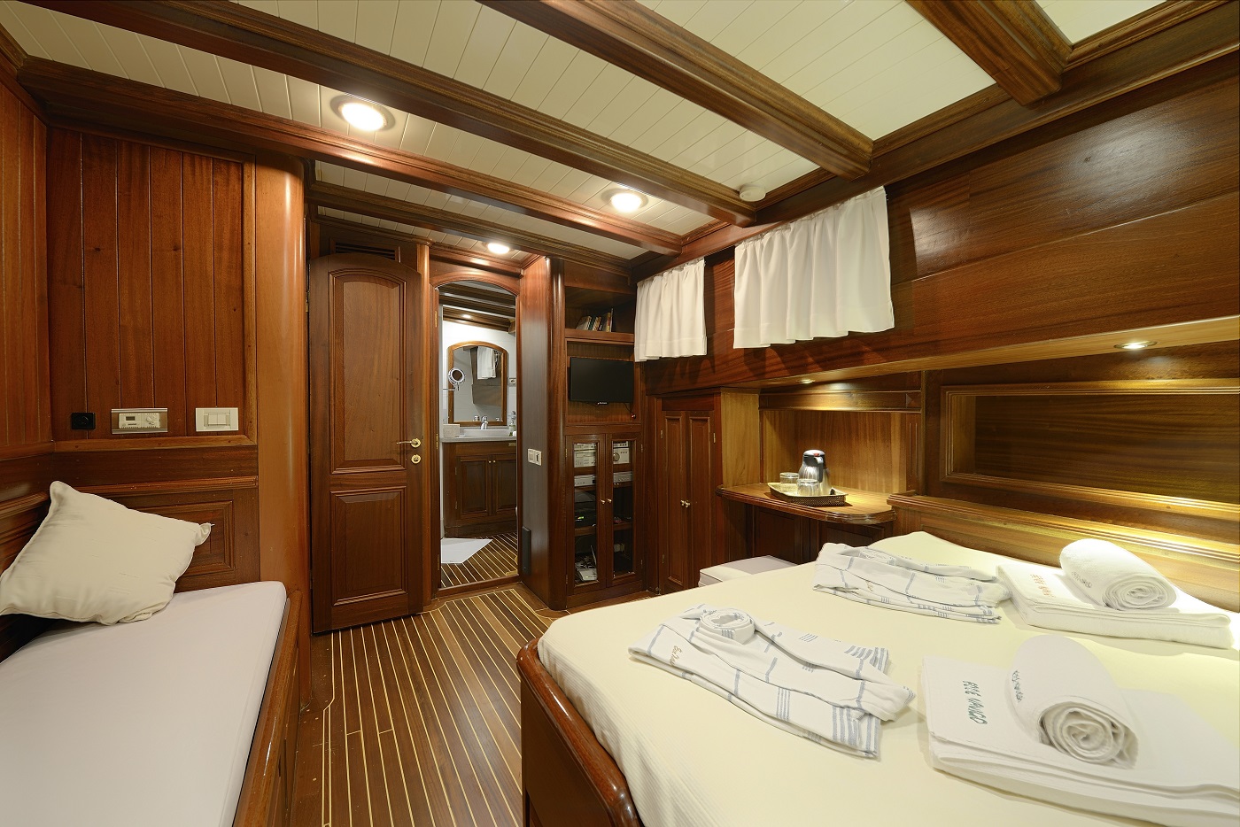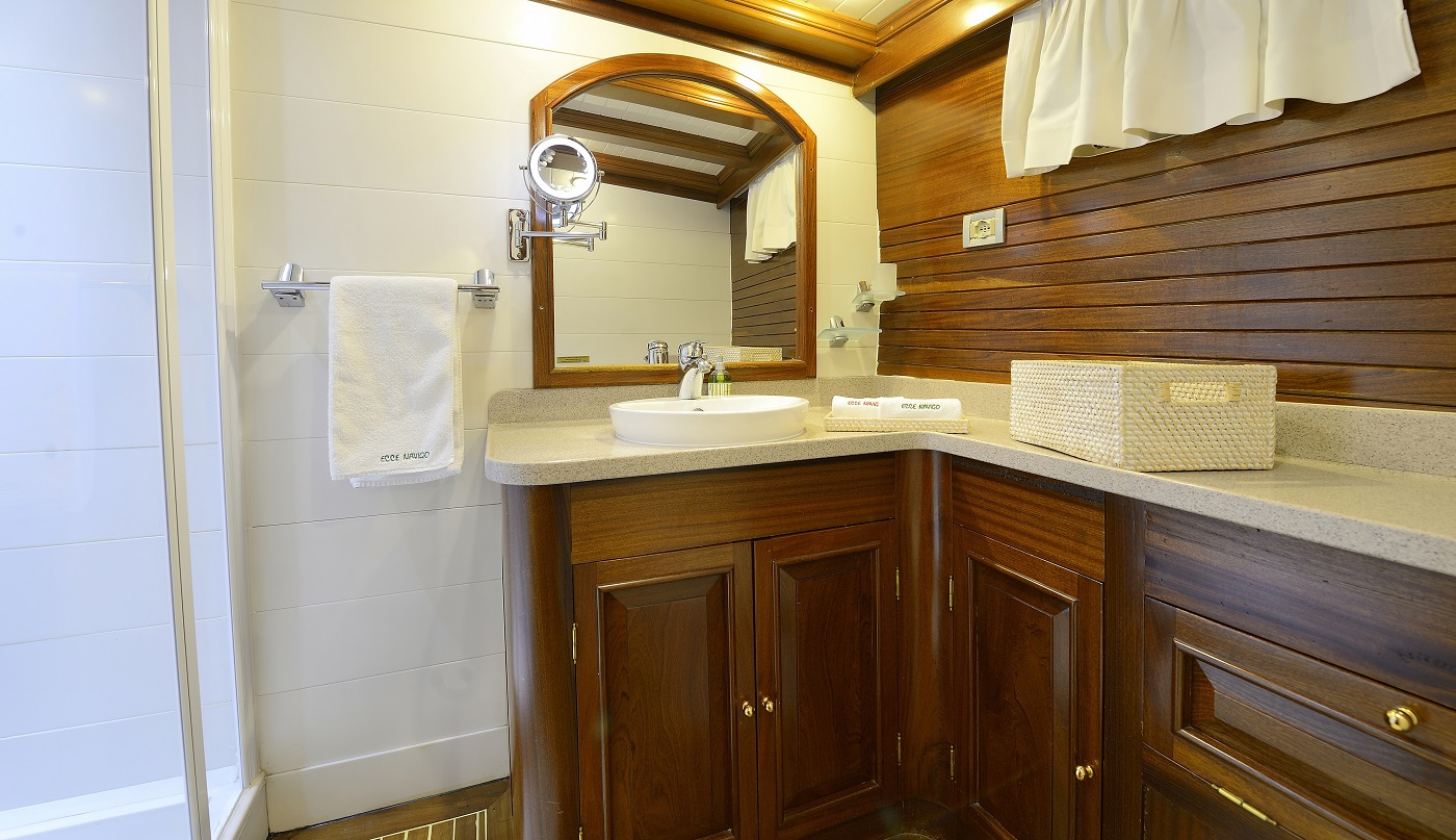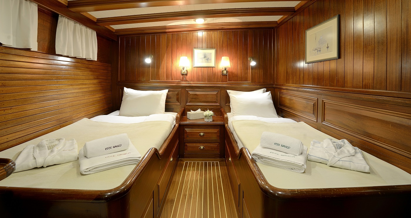 Ecce Navigo, Yunan Adaları’nda mavi yolculuk deneyimini bir üst seviyeye taşıyan, zarafeti ve konforu ile öne çıkan delüks guletlerden biridir. 1997 yılında denize indirilen teknemiz, 2023 yılında gerçekleştirilen kapsamlı yenileme çalışmaları sayesinde modern ve göz alıcı tasarımıyla yeniden misafirlerini ağırlamaya başlamıştır.
