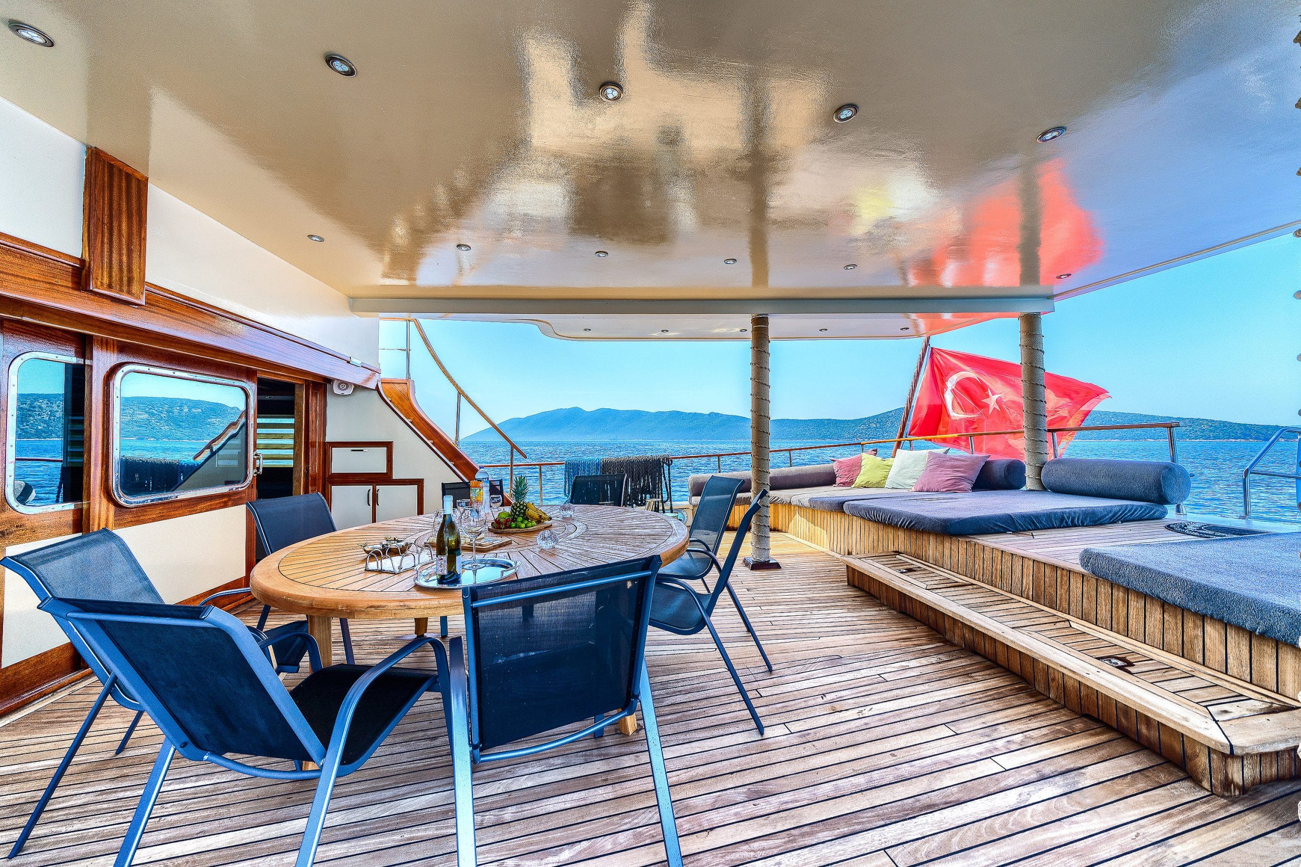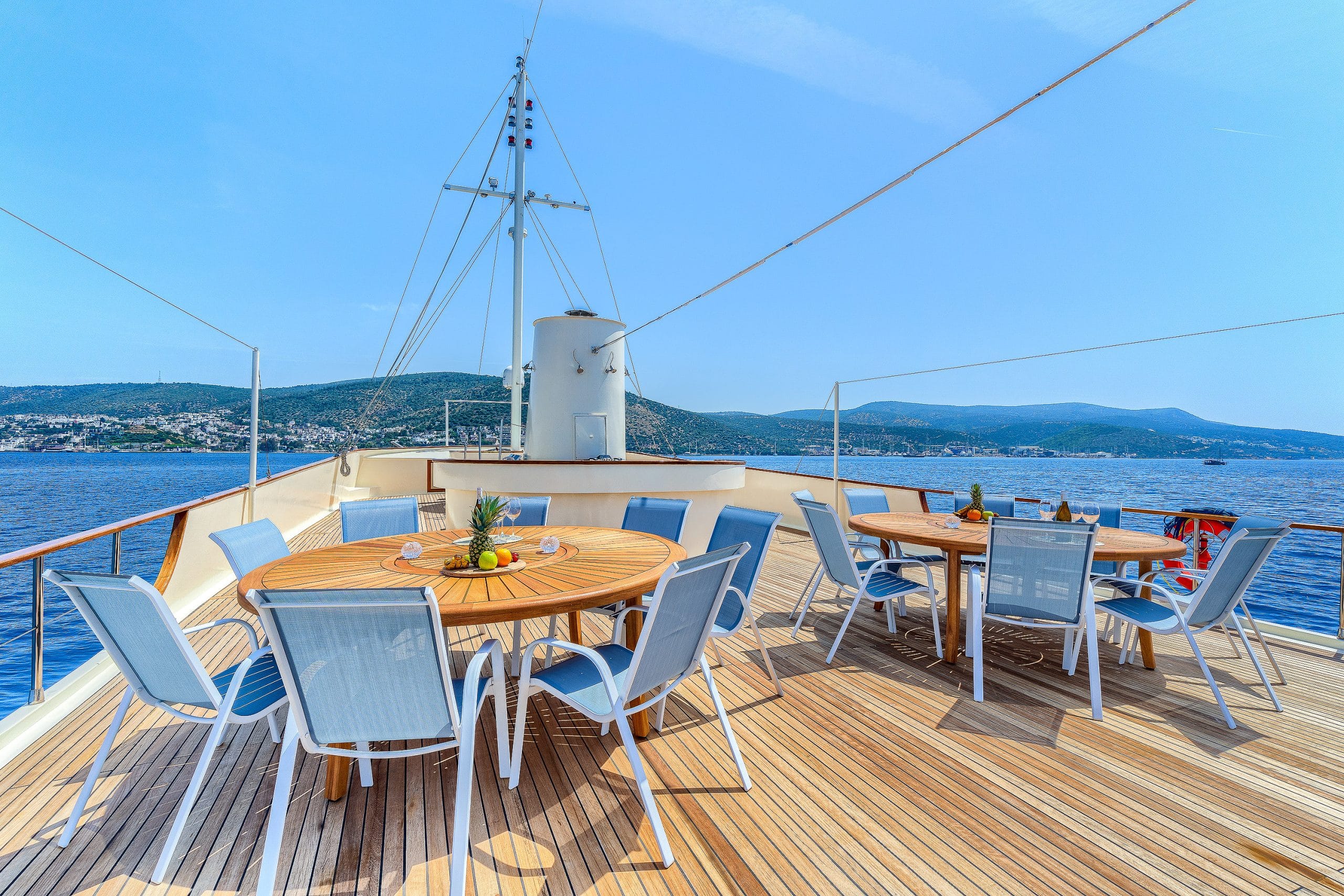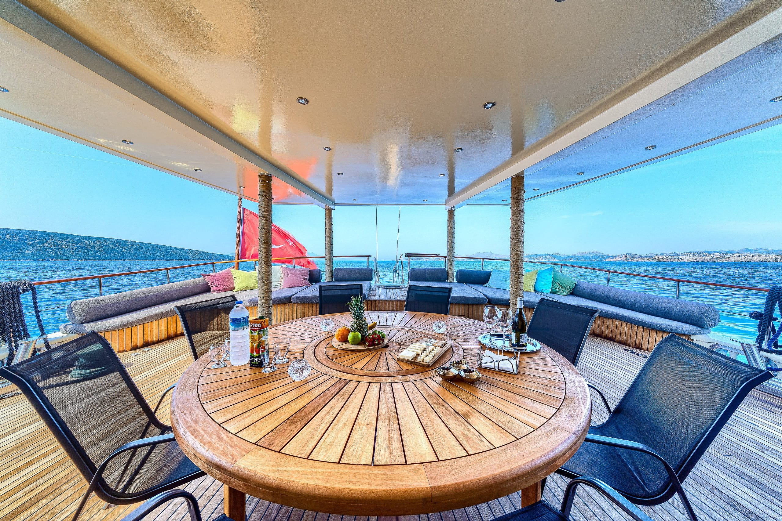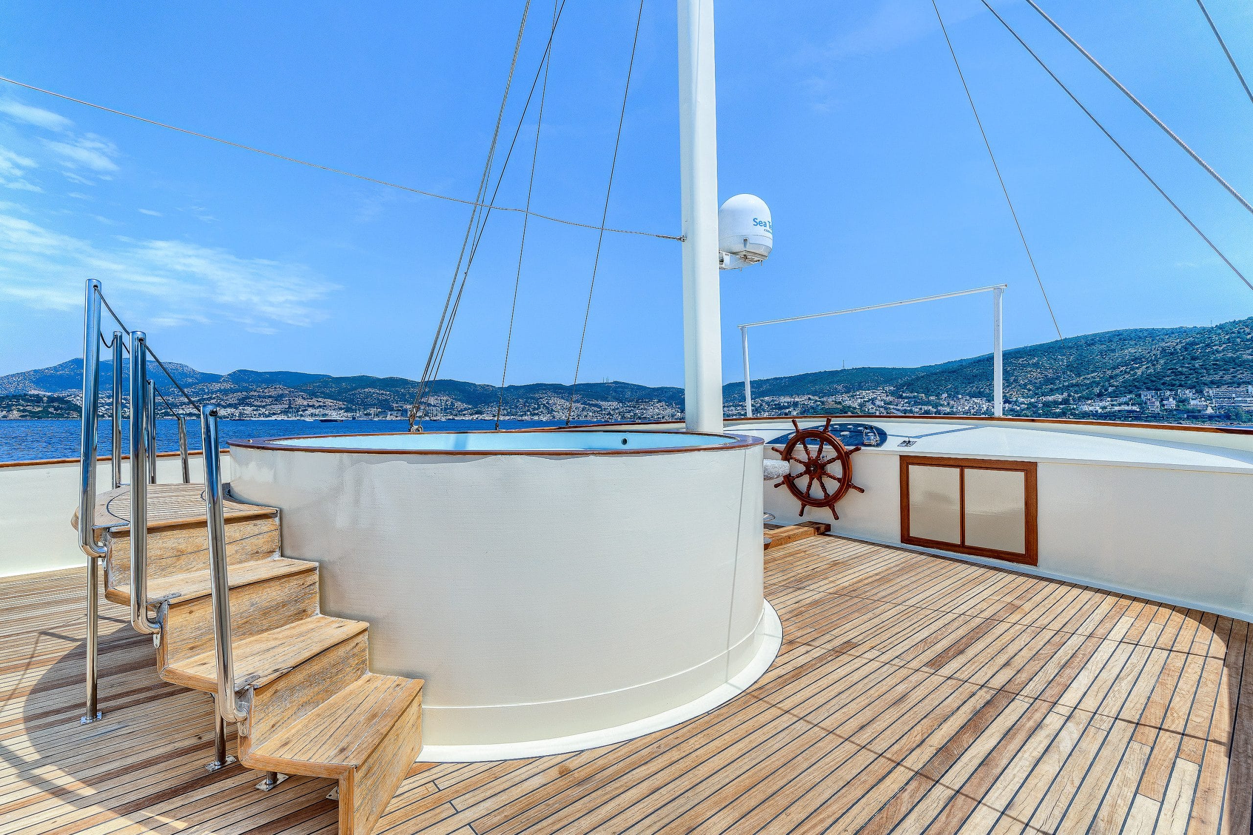 Elara 1’in dikkat çeken ana güvertesi, konuklarına ferah bir atmosfer sunar. Geniş güneşlenme terası, konforlu şezlongları ve açık hava yemek alanı ile gün boyu rahatlamanın tadını çıkarabilirsiniz. Kraliyet jakuzisi ise denizde lüksü bir adım öteye taşır. Gemide yer alan özel bar alanı, misafirlere keyifli anlar yaşatmak için özenle tasarlanmıştır.