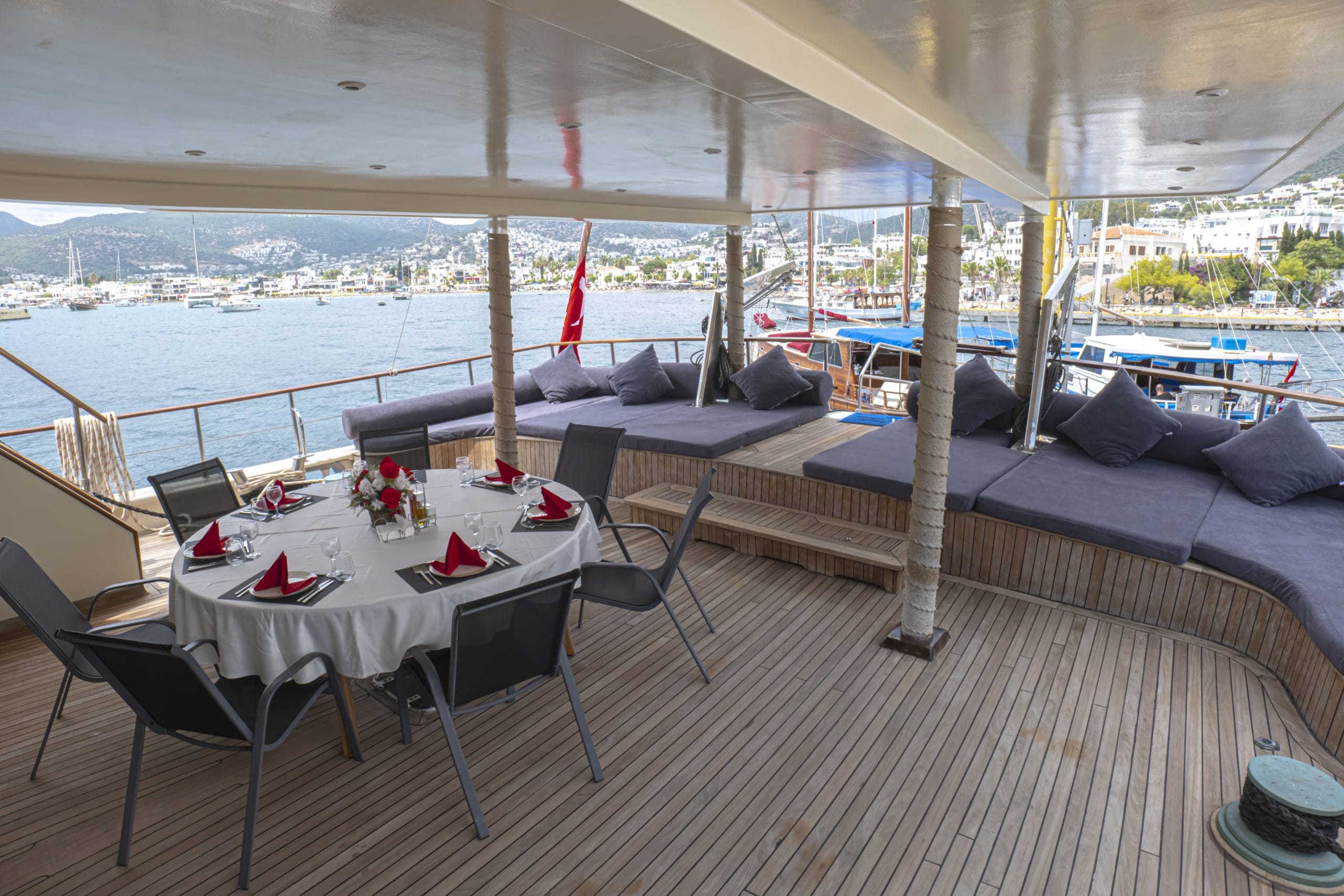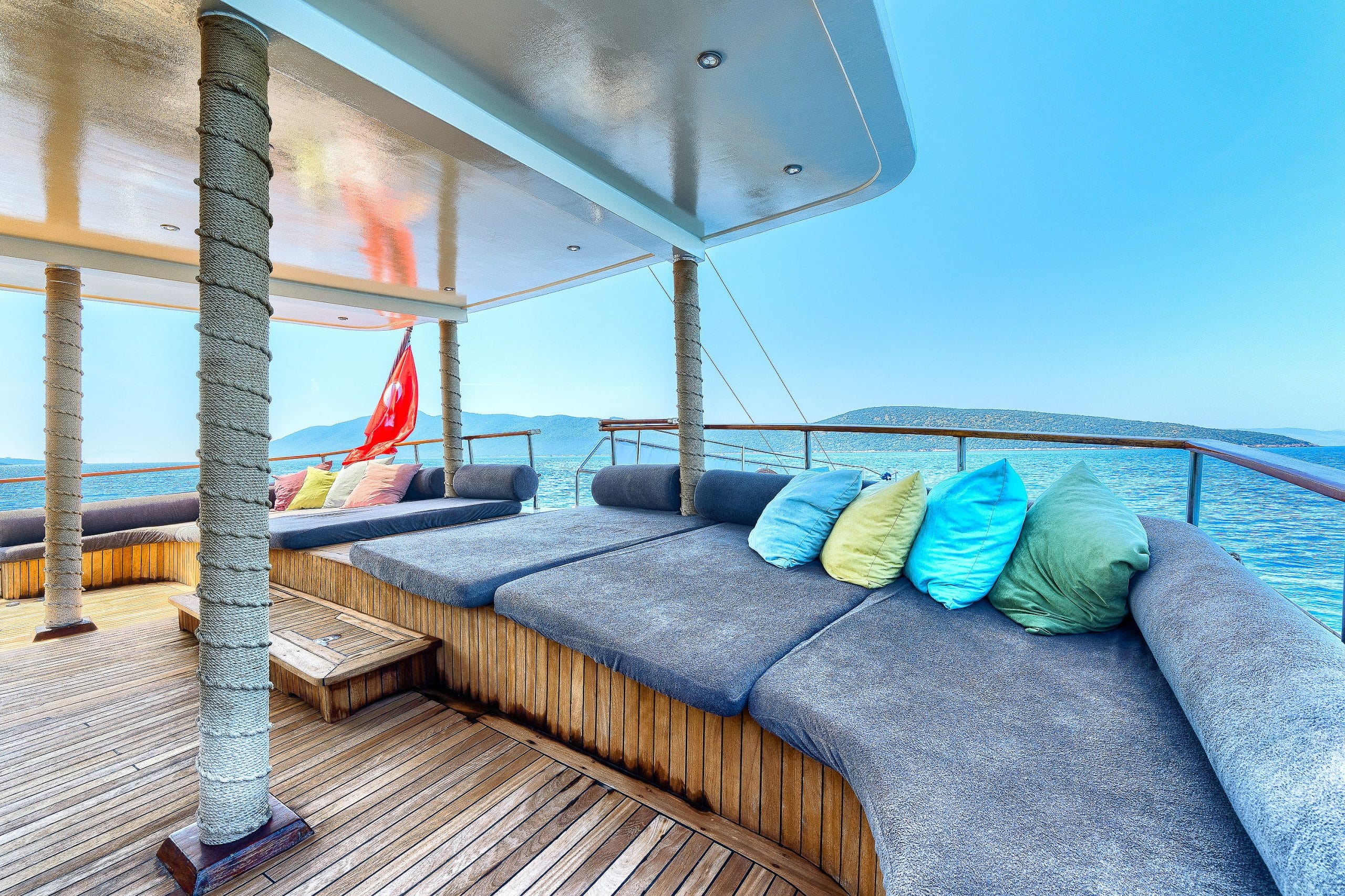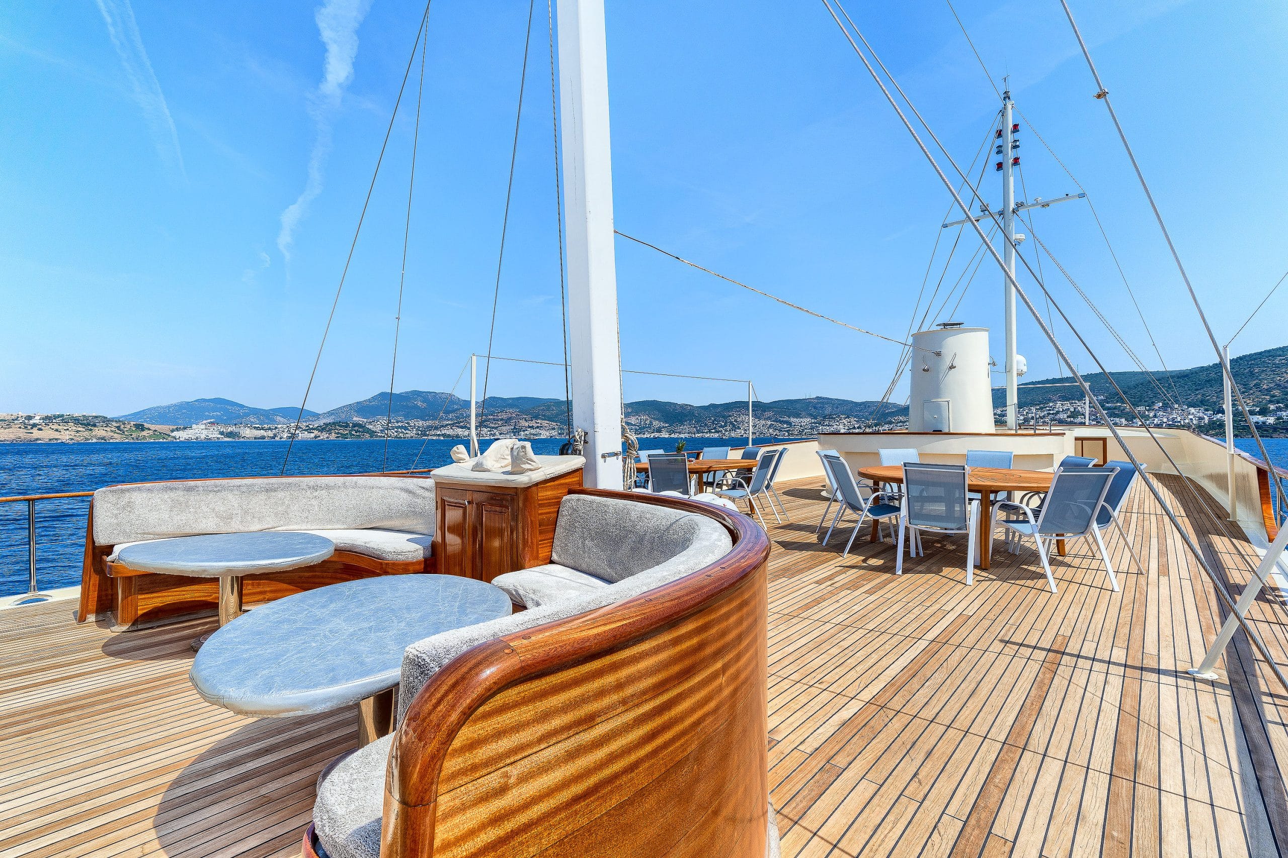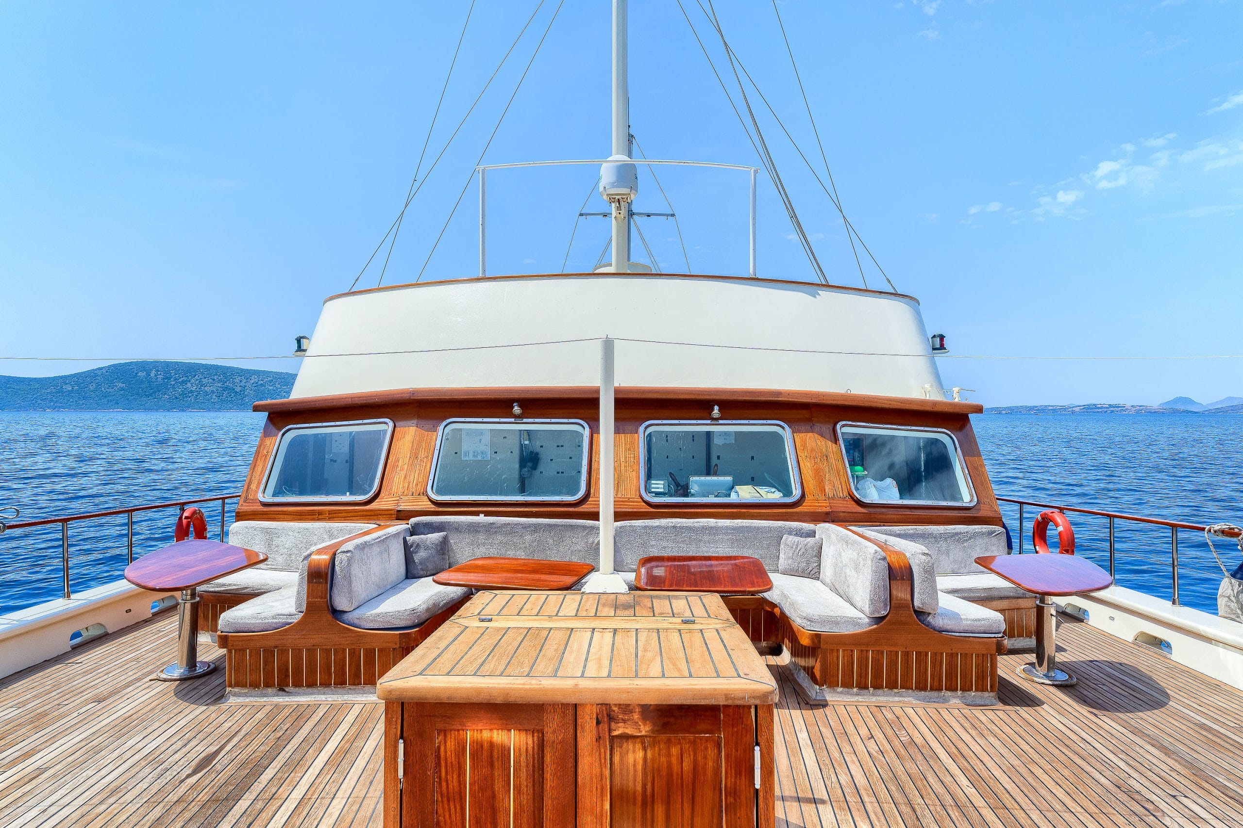Elara 1’in dikkat çeken ana güvertesi, konuklarına ferah bir atmosfer sunar. Geniş güneşlenme terası, konforlu şezlongları ve açık hava yemek alanı ile gün boyu rahatlamanın tadını çıkarabilirsiniz. Kraliyet jakuzisi ise denizde lüksü bir adım öteye taşır. Gemide yer alan özel bar alanı, misafirlere keyifli anlar yaşatmak için özenle tasarlanmıştır.