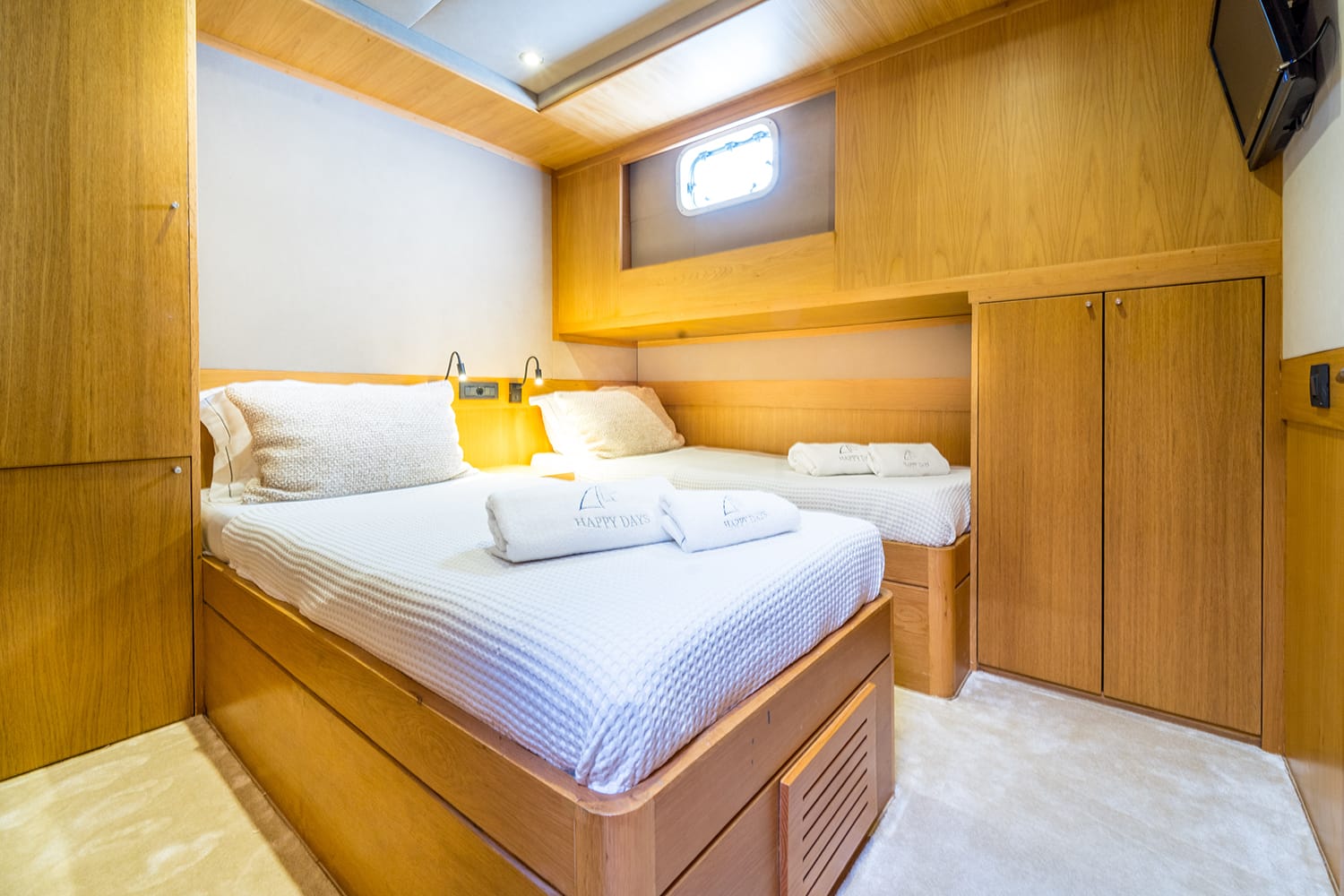 Happy Days, 30 metre uzunluğu ve 6,9 metre genişliğiyle misafirlerine konforlu ve keyifli bir mavi yolculuk deneyimi sunmaktadır. 2011 yılında inşa edilen guletimiz, 2021 yılında gerçekleştirilen kapsamlı renovasyon çalışmalarıyla modern ve zarif tasarımıyla yenilenmiştir.