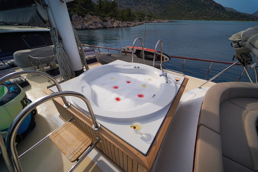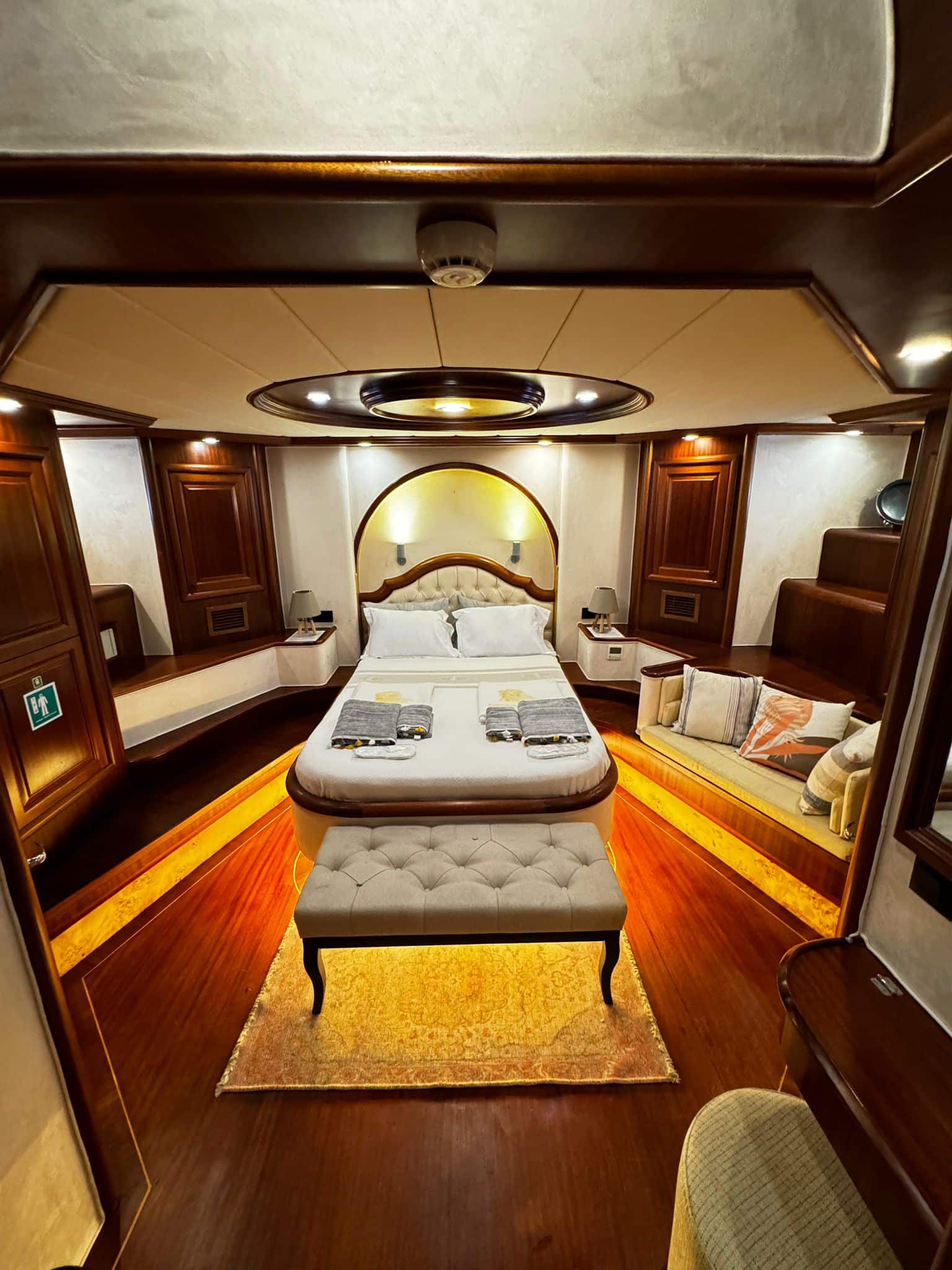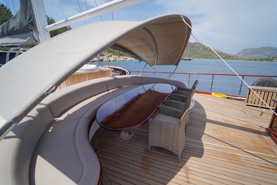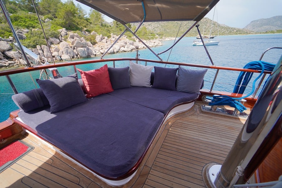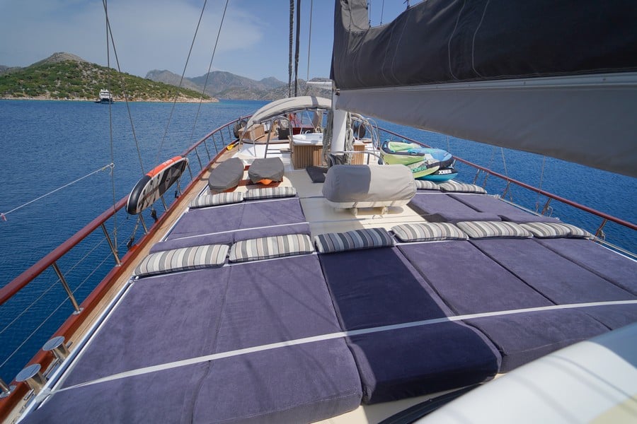 34 metre uzunluğunda ve 8,2 metre genişliğinde olan delüks guletimiz, geniş ve ferah yaşam alanlarıyla misafirlerine unutulmaz bir mavi yolculuk deneyimi sunar. Güvertesinde yer alan jakuzi, deniz üzerinde geçirdiğiniz tatili lüks bir keyif anına dönüştürür.