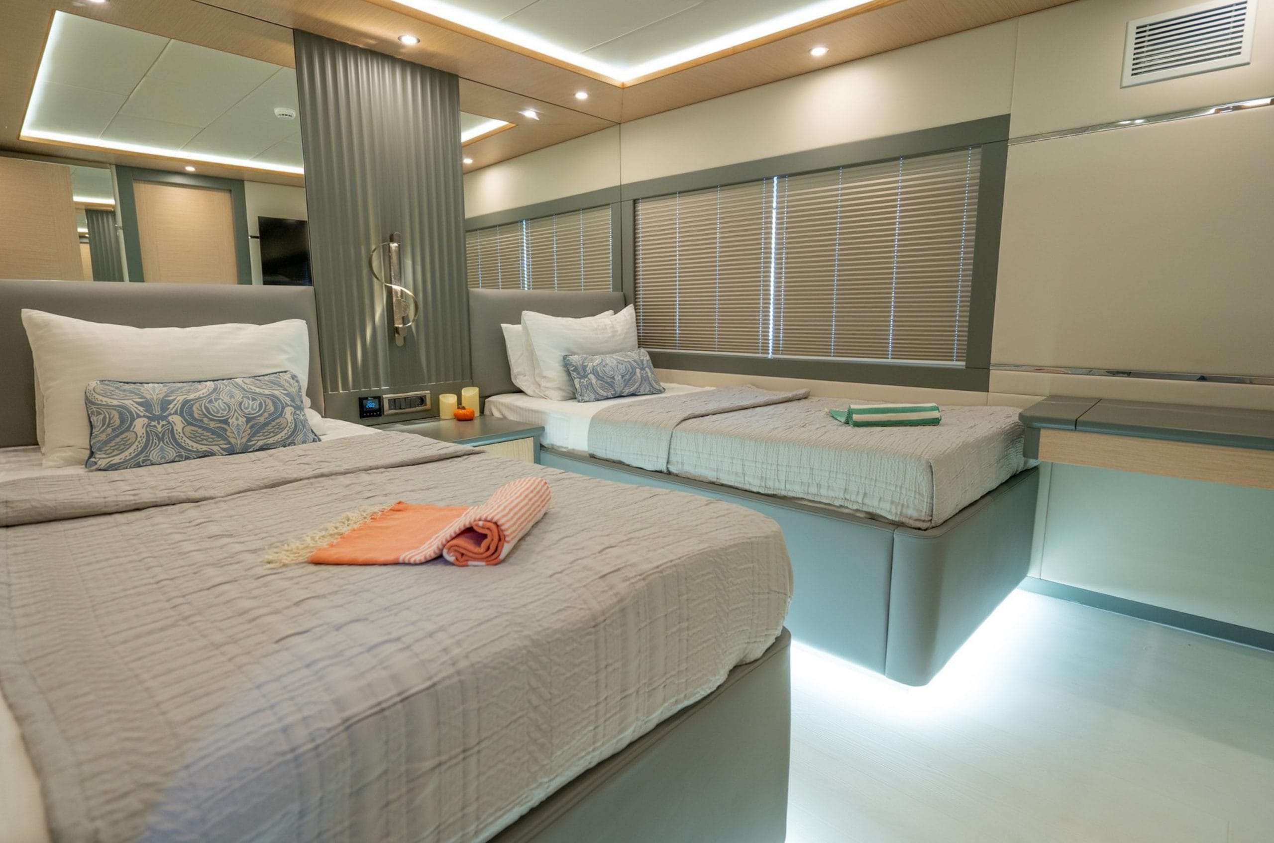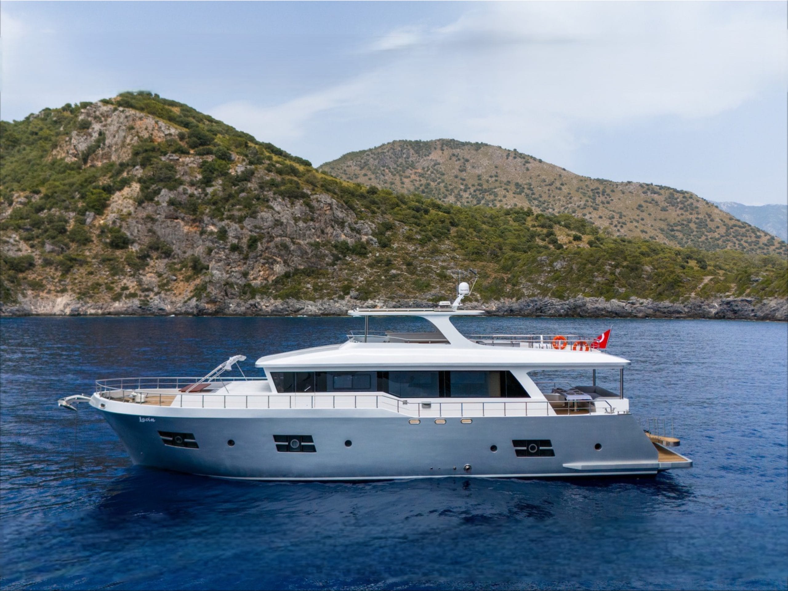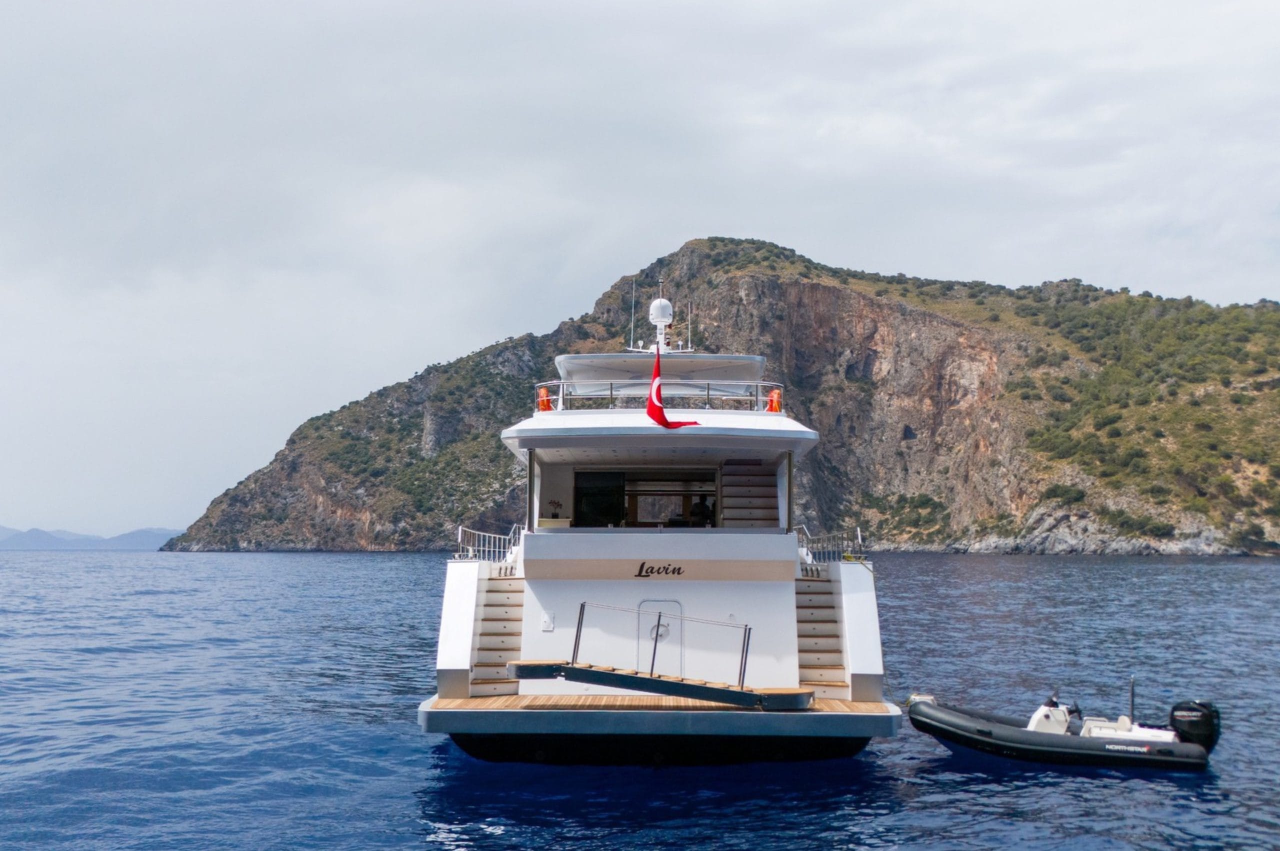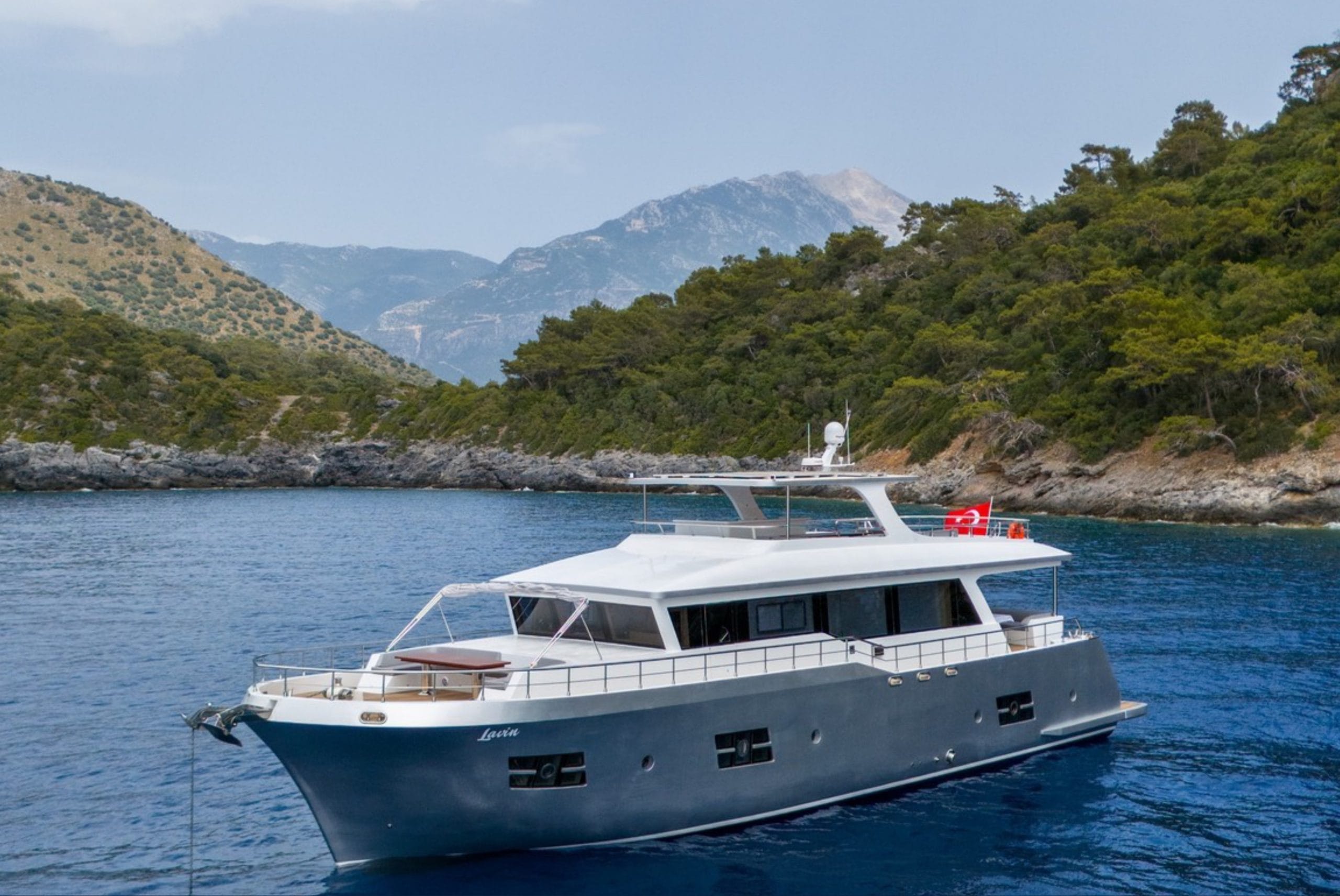 2024 yılında inşa edilen Lavin, modern tasarımı ve yüksek konfor standartlarıyla misafirlerine ayrıcalıklı bir mavi yolculuk deneyimi sunar. 26,50 metre uzunluğa ve 7,20 metre genişliğe sahip bu zarif trawler, 2 master, 1 double ve 1 twin olmak üzere toplam 4 lüks kabin ile 8 kişiye kadar konaklama imkânı sağlamaktadır. Her kabinde özel banyo, WC ve klima bulunmaktadır.