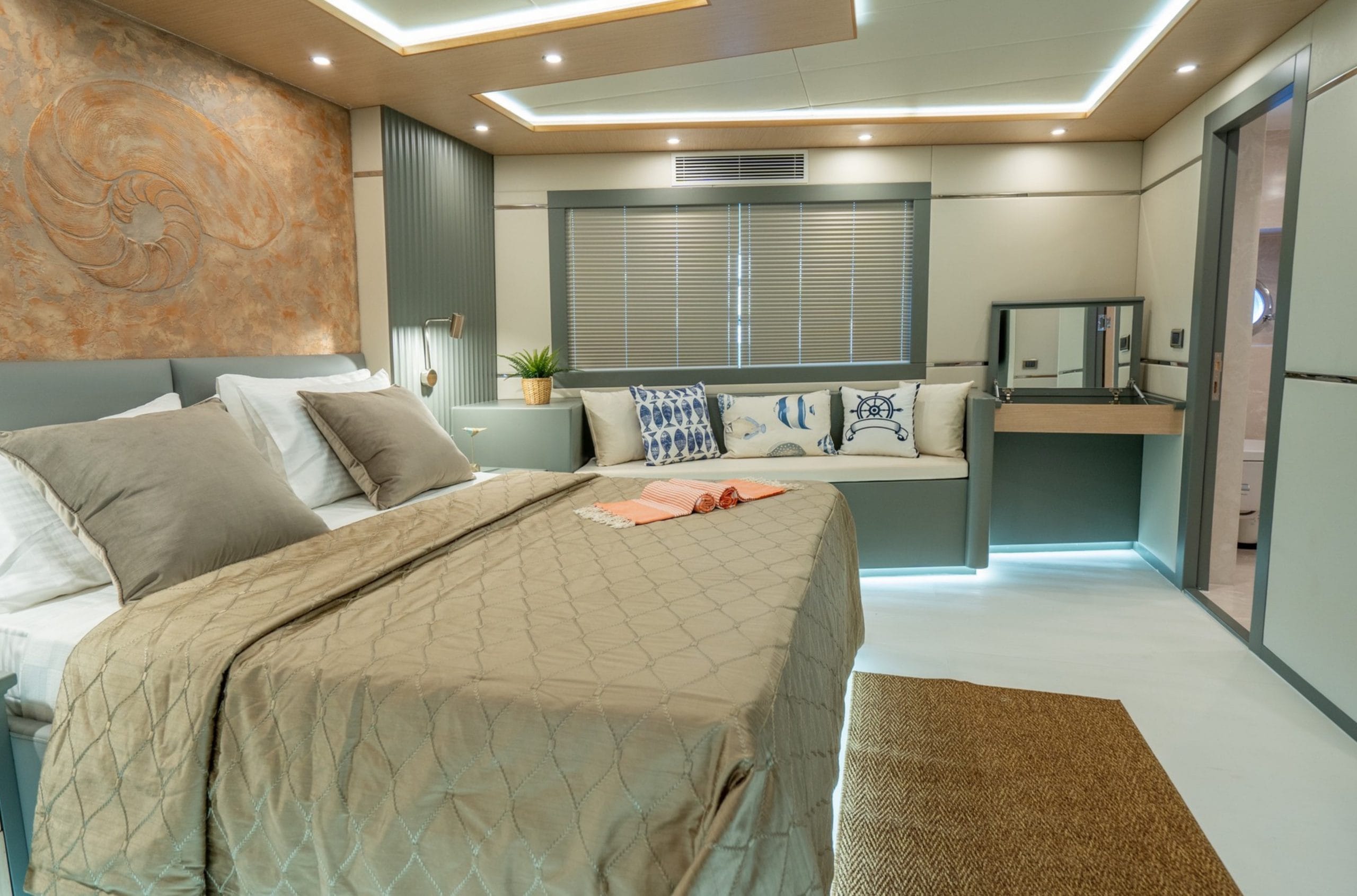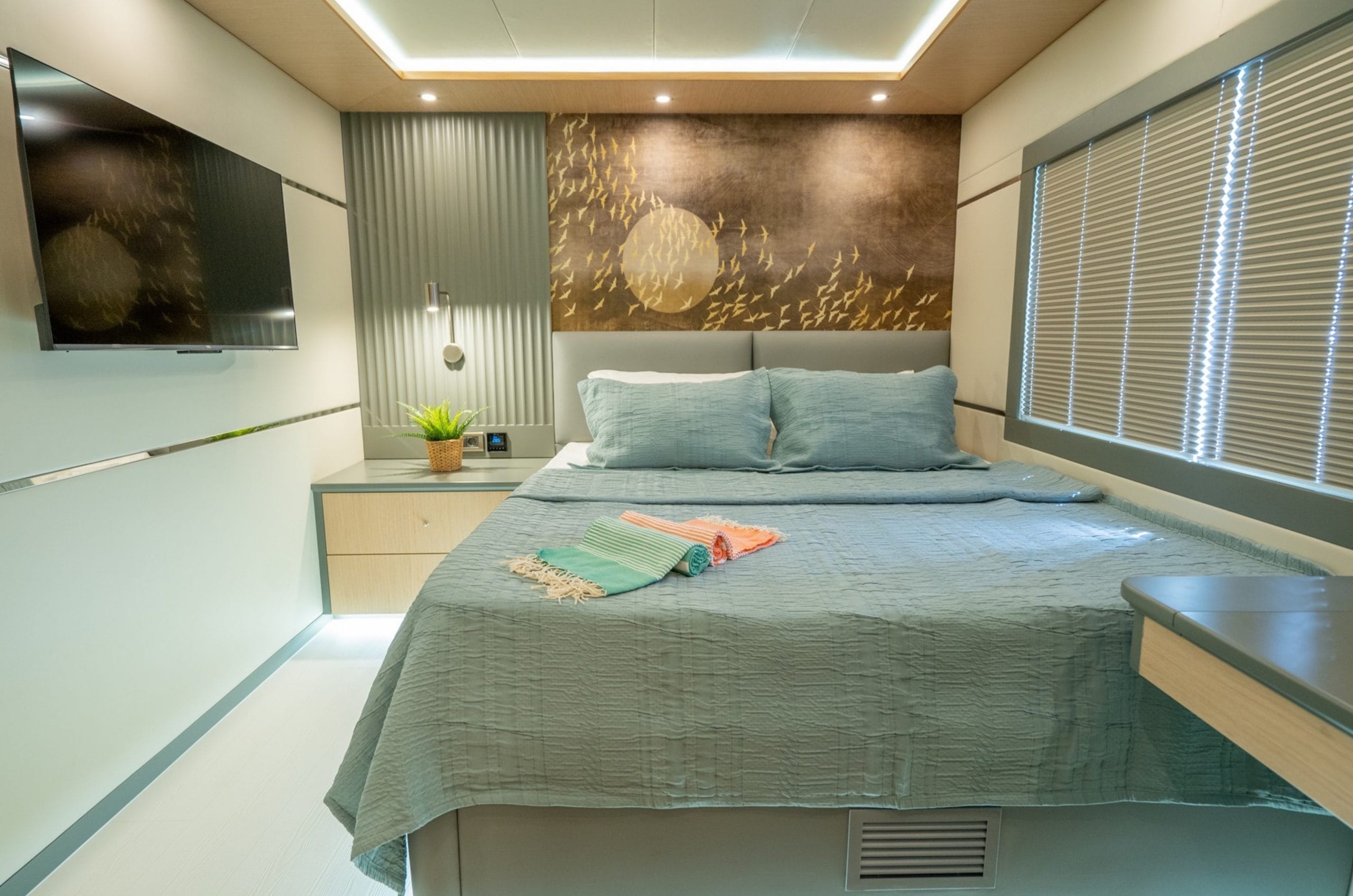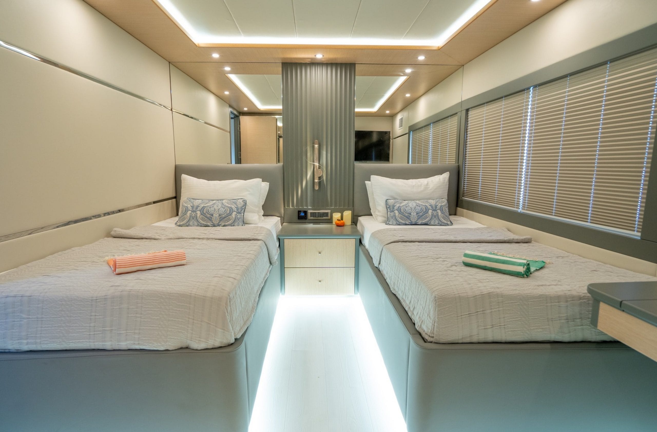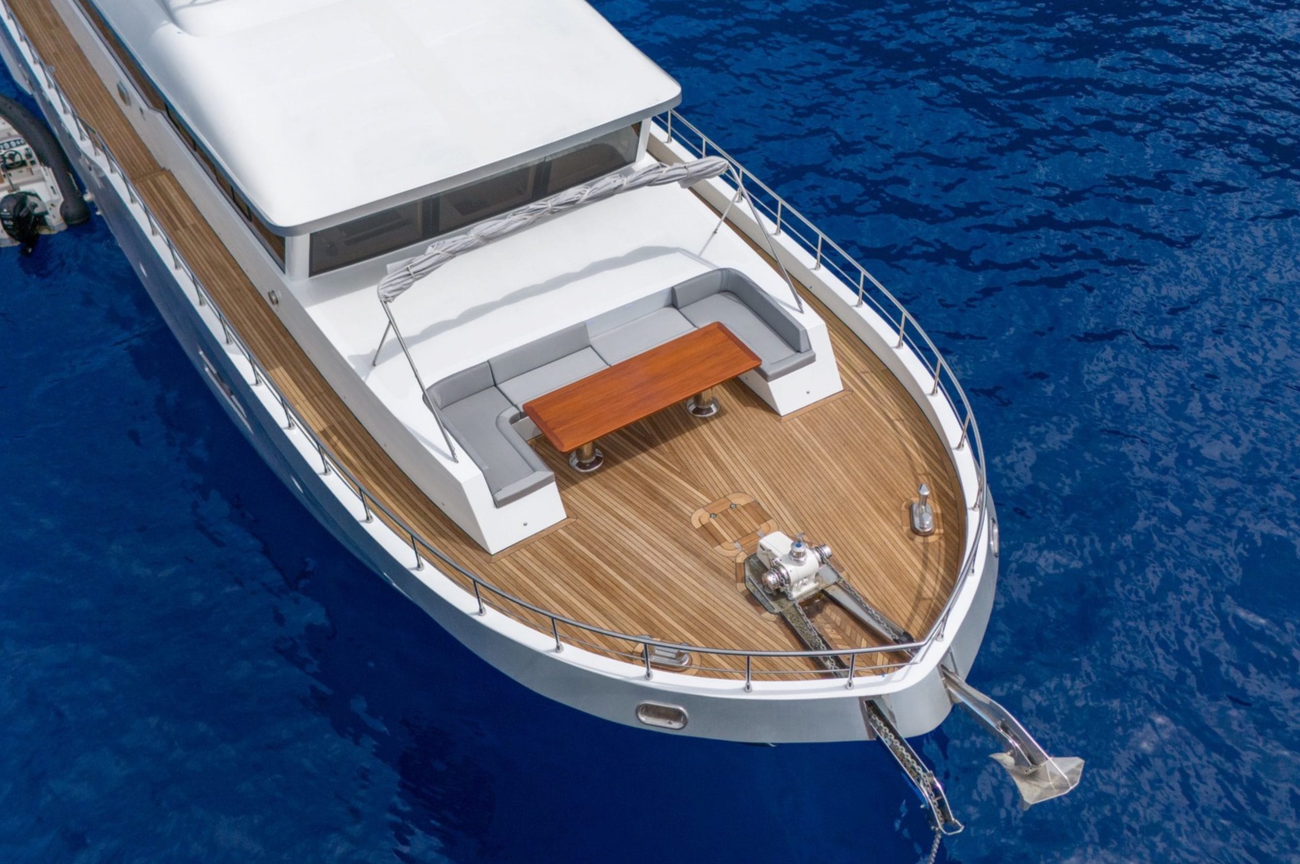 2024 yılında inşa edilen Lavin, modern tasarımı ve yüksek konfor standartlarıyla misafirlerine ayrıcalıklı bir mavi yolculuk deneyimi sunar. 26,50 metre uzunluğa ve 7,20 metre genişliğe sahip bu zarif trawler, 2 master, 1 double ve 1 twin olmak üzere toplam 4 lüks kabin ile 8 kişiye kadar konaklama imkânı sağlamaktadır. Her kabinde özel banyo, WC ve klima bulunmaktadır.