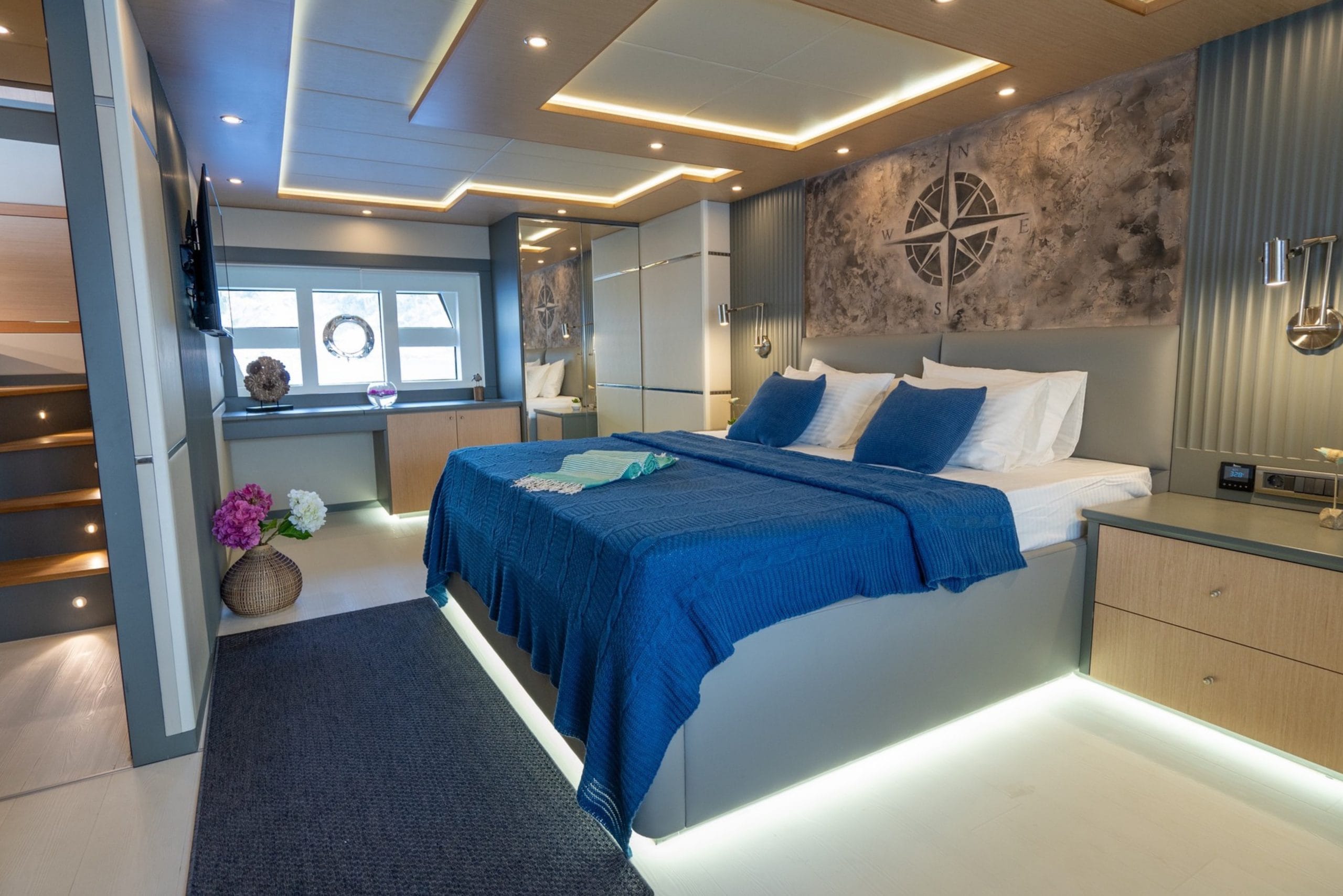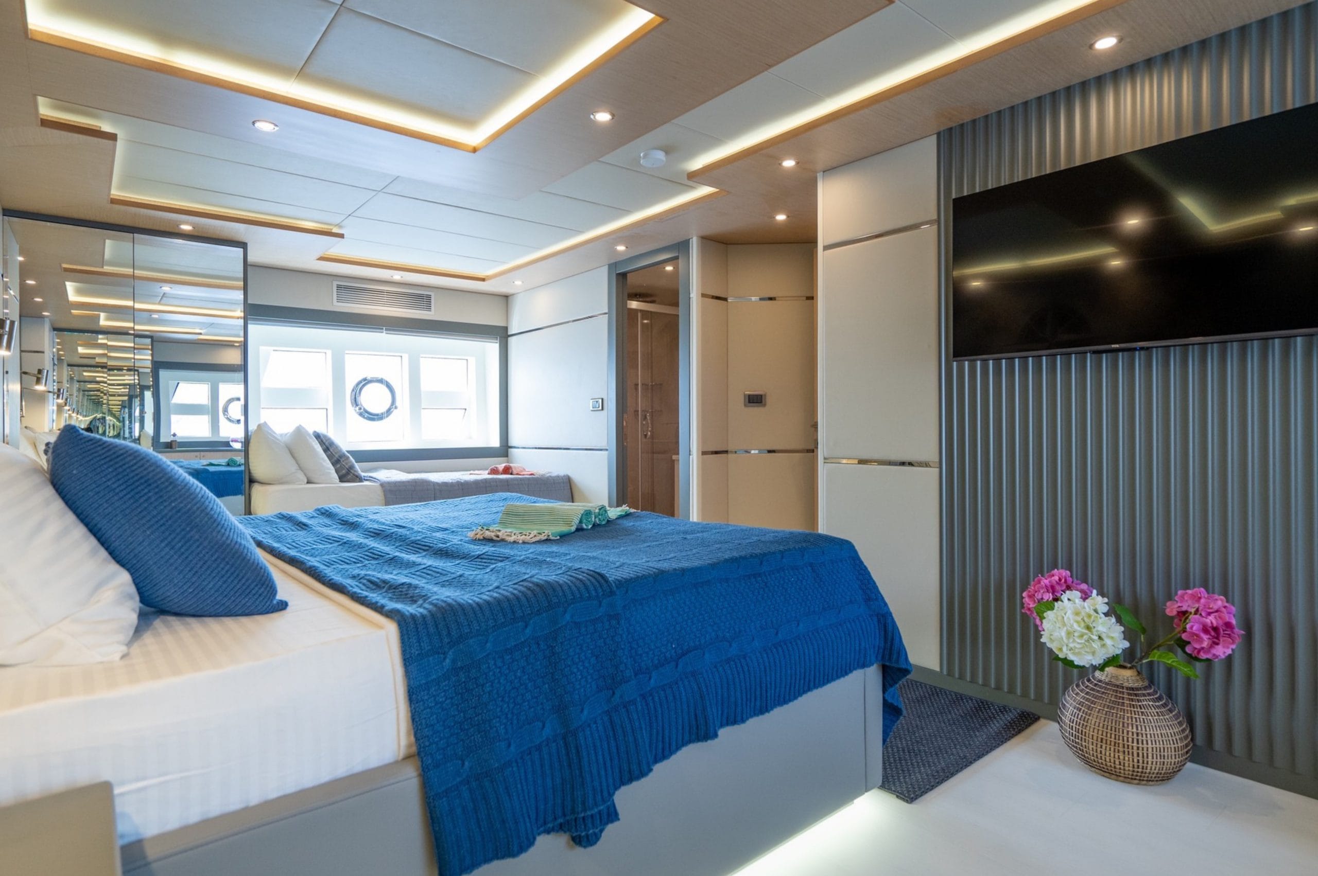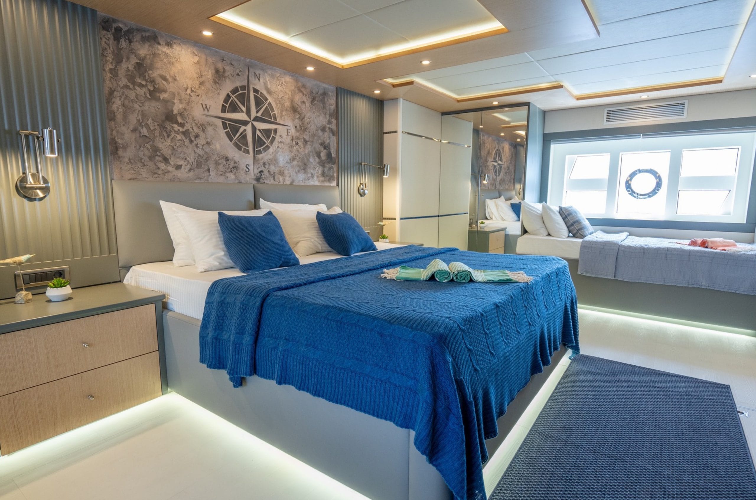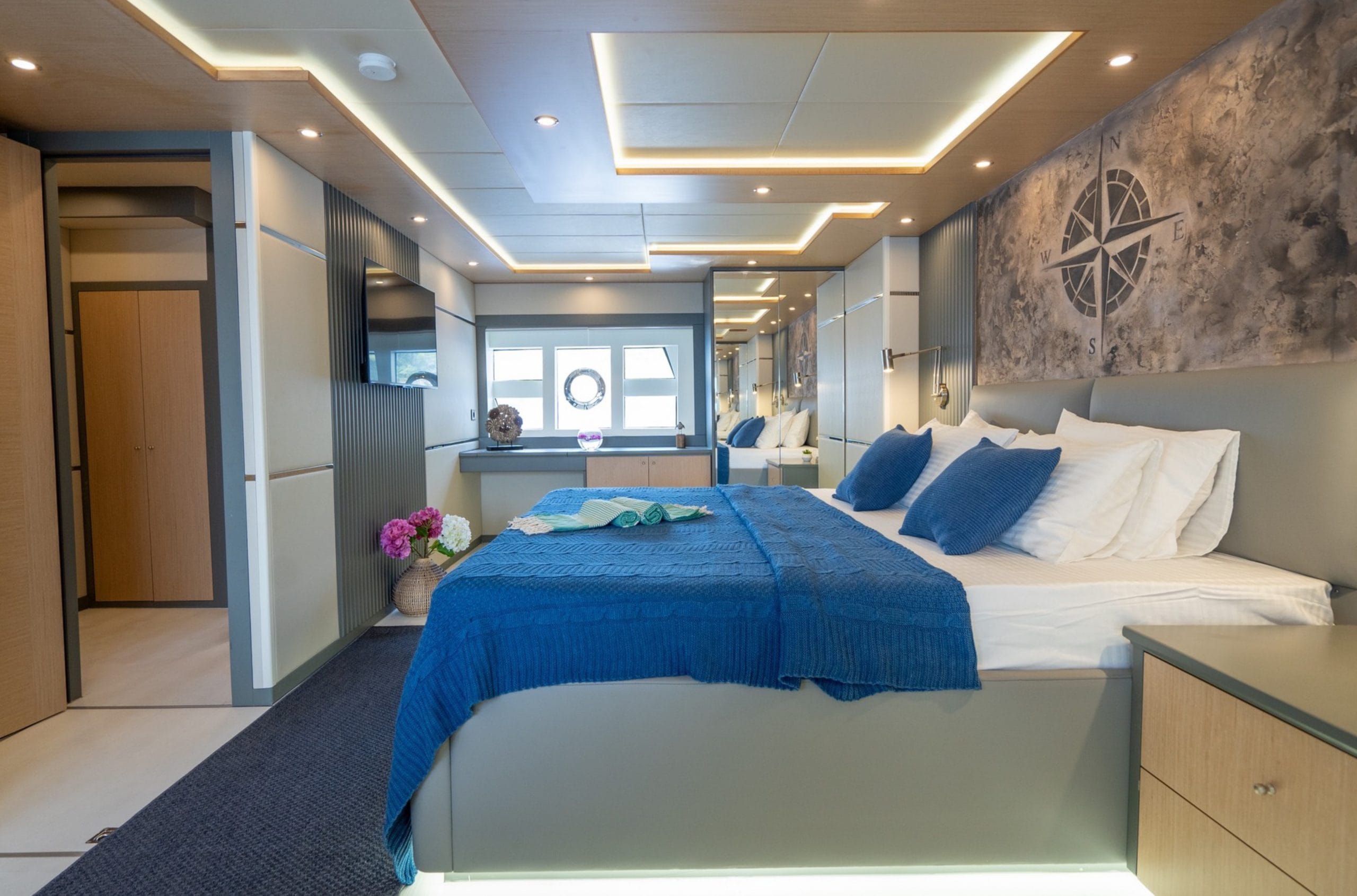 2024 yılında inşa edilen Lavin, modern tasarımı ve yüksek konfor standartlarıyla misafirlerine ayrıcalıklı bir mavi yolculuk deneyimi sunar. 26,50 metre uzunluğa ve 7,20 metre genişliğe sahip bu zarif trawler, 2 master, 1 double ve 1 twin olmak üzere toplam 4 lüks kabin ile 8 kişiye kadar konaklama imkânı sağlamaktadır. Her kabinde özel banyo, WC ve klima bulunmaktadır.