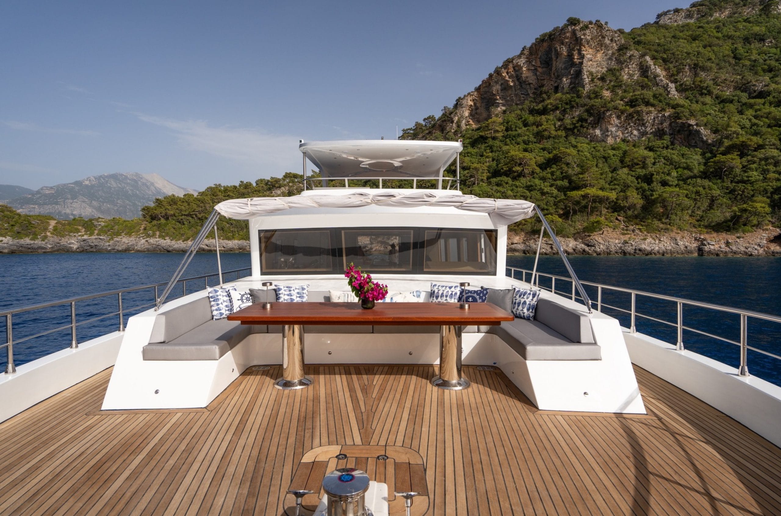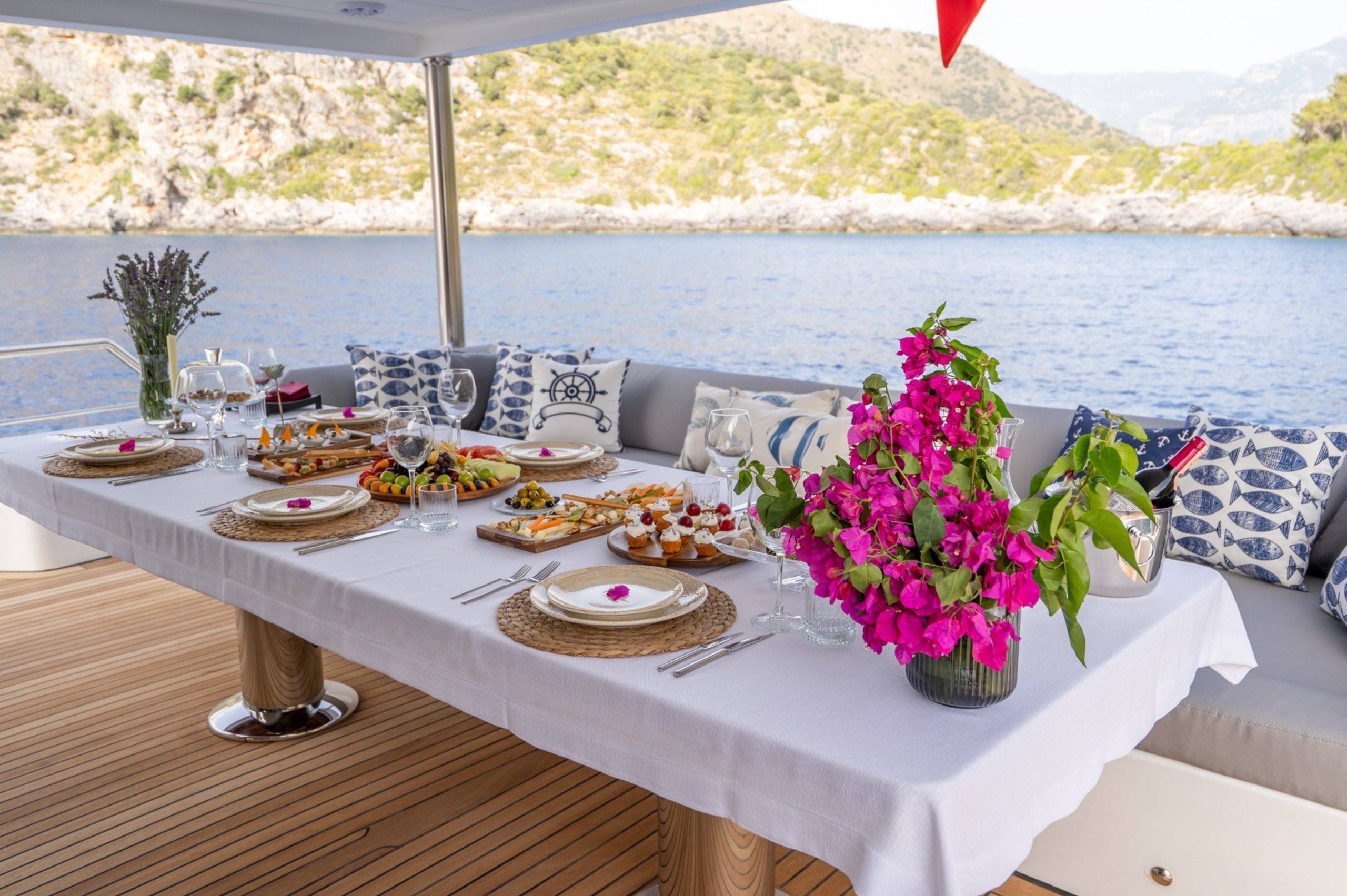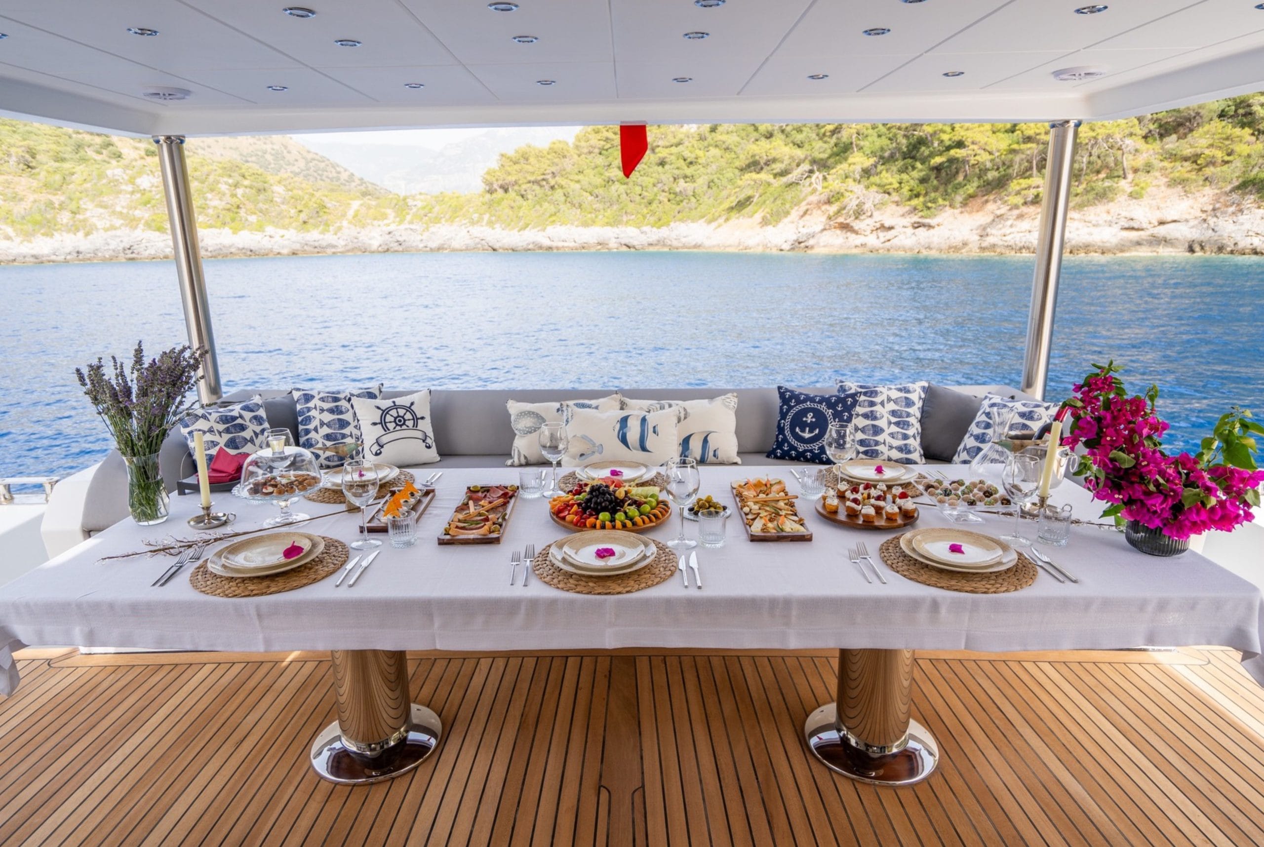 Açık hava yaşam alanları, güneşlenme ve dinlenme bölümleri ile keyifli zaman geçirmenizi sağlayan Lavin’de, aynı zamanda açık havada yemek alanları ve bar da mevcuttur. Tam donanımlı mutfağımızda özenle hazırlanan lezzetli yemeklerimizi güvertedeki masamızda deniz manzarası eşliğinde tadabilirsiniz.