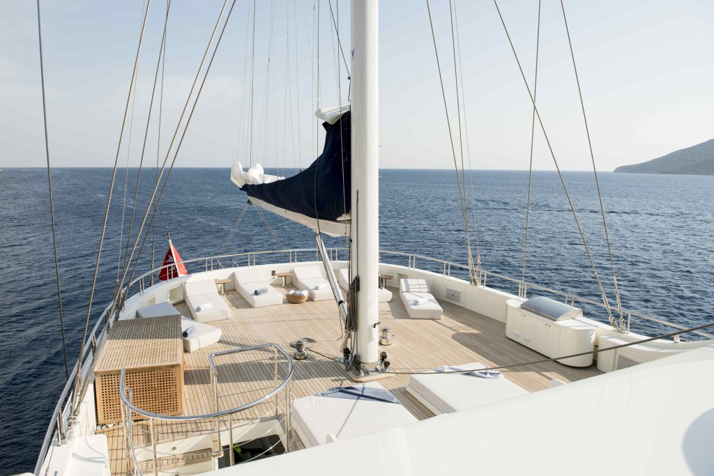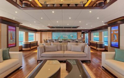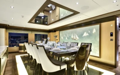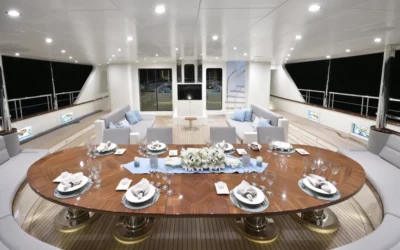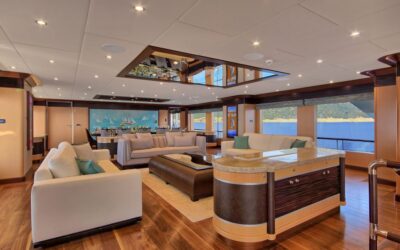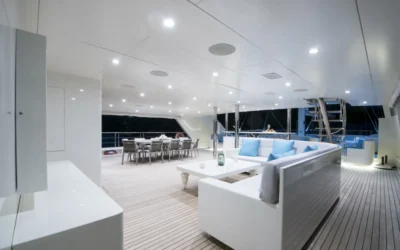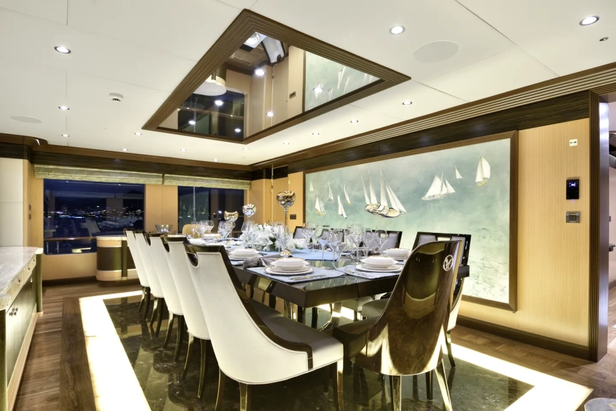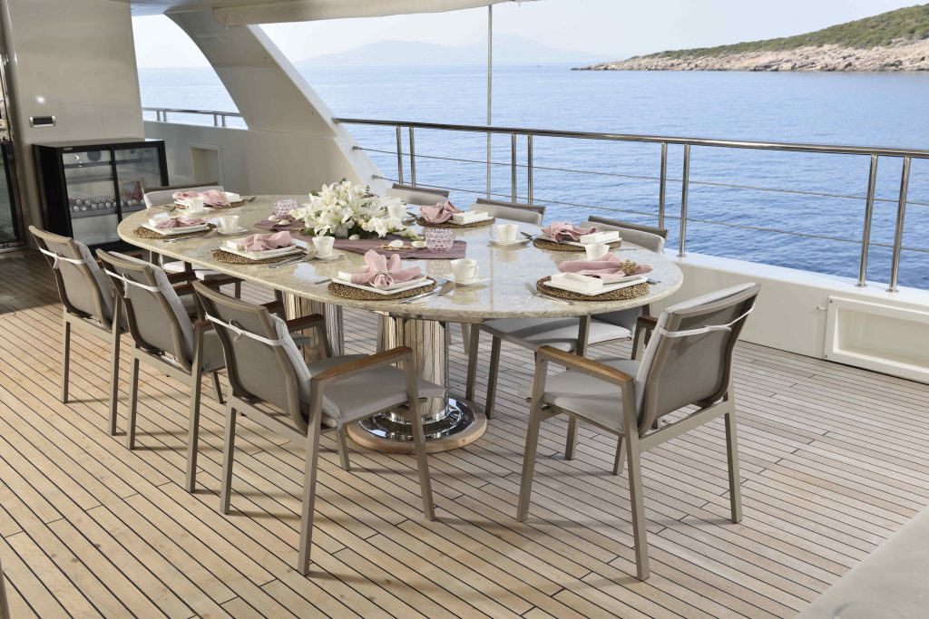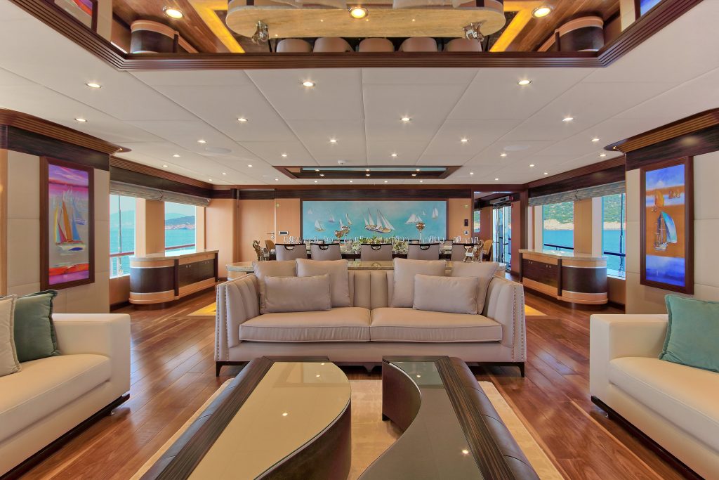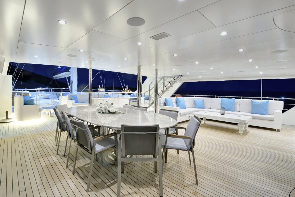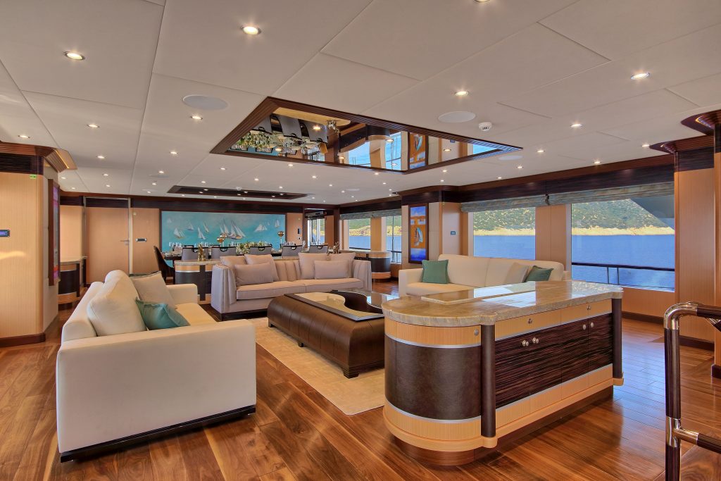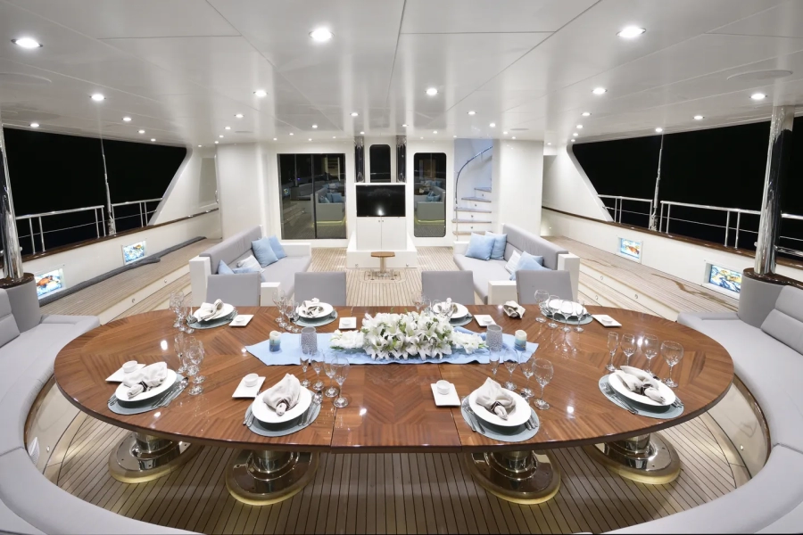 Ana güvertede ayrıca panoramik pencerelere sahip geniş salon, rahat oturma gruplarıyla ferah bir yaşam alanı sunarken, 12 kişilik resmi yemek alanı ve tam donanımlı bir bar da misafirlerin kullanımına sunulmaktadır.