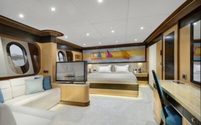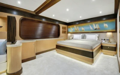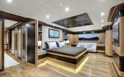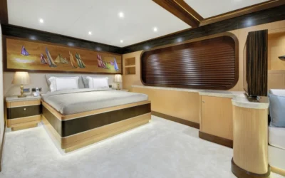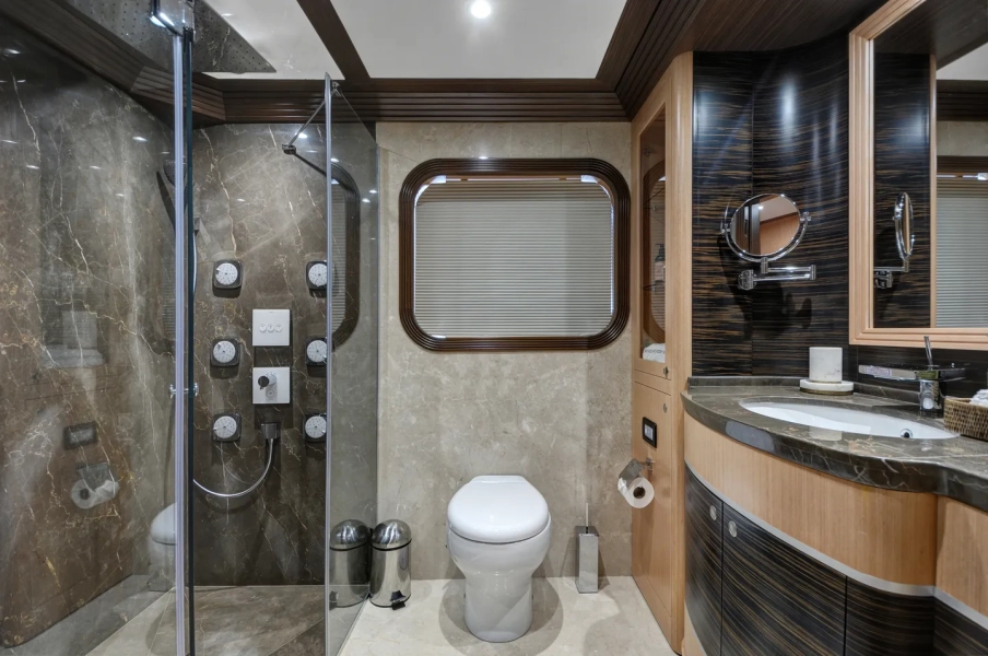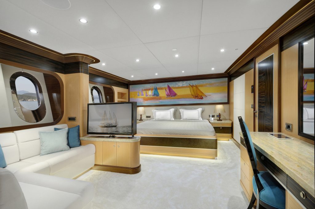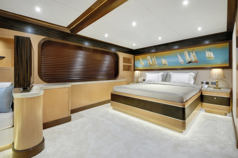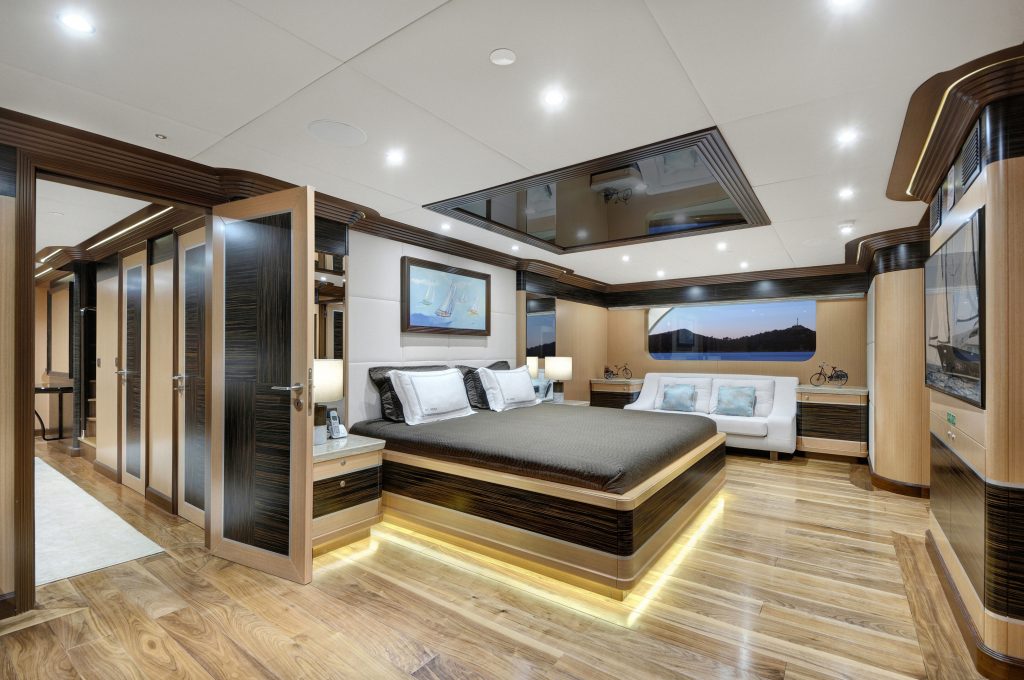 Ana güvertede yer alan master kabinimiz, iki ayrı giyinme odası, mini bar, geniş bir kanepeyle donatılmış oturma alanı ve ebeveyn banyosu gibi üst düzey donanımlarla tasarlanmıştır. Ayrıca klima, perdeler, aydınlatma ve TV/müzik sistemlerinin tek noktadan kontrol edilebildiği son teknoloji ev otomasyonu ve eğlence sistemine sahiptir.