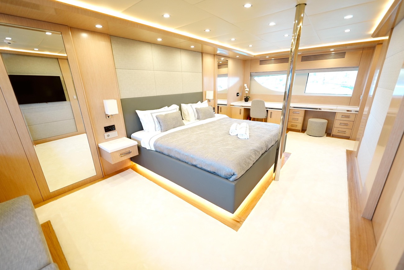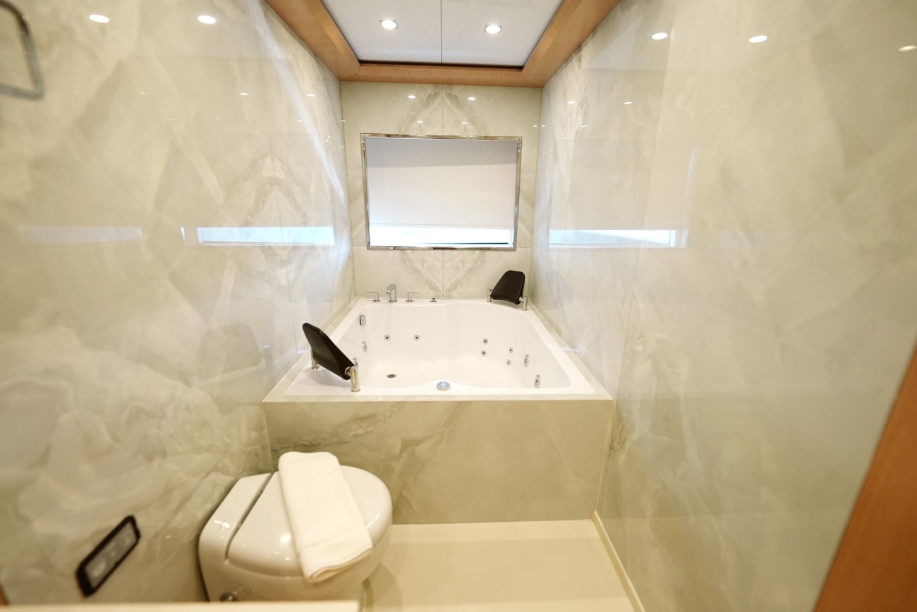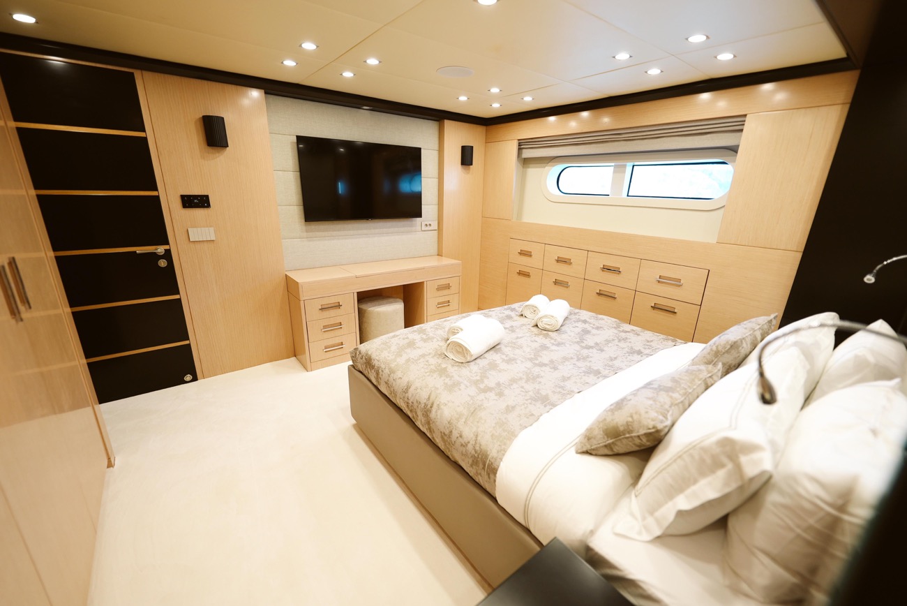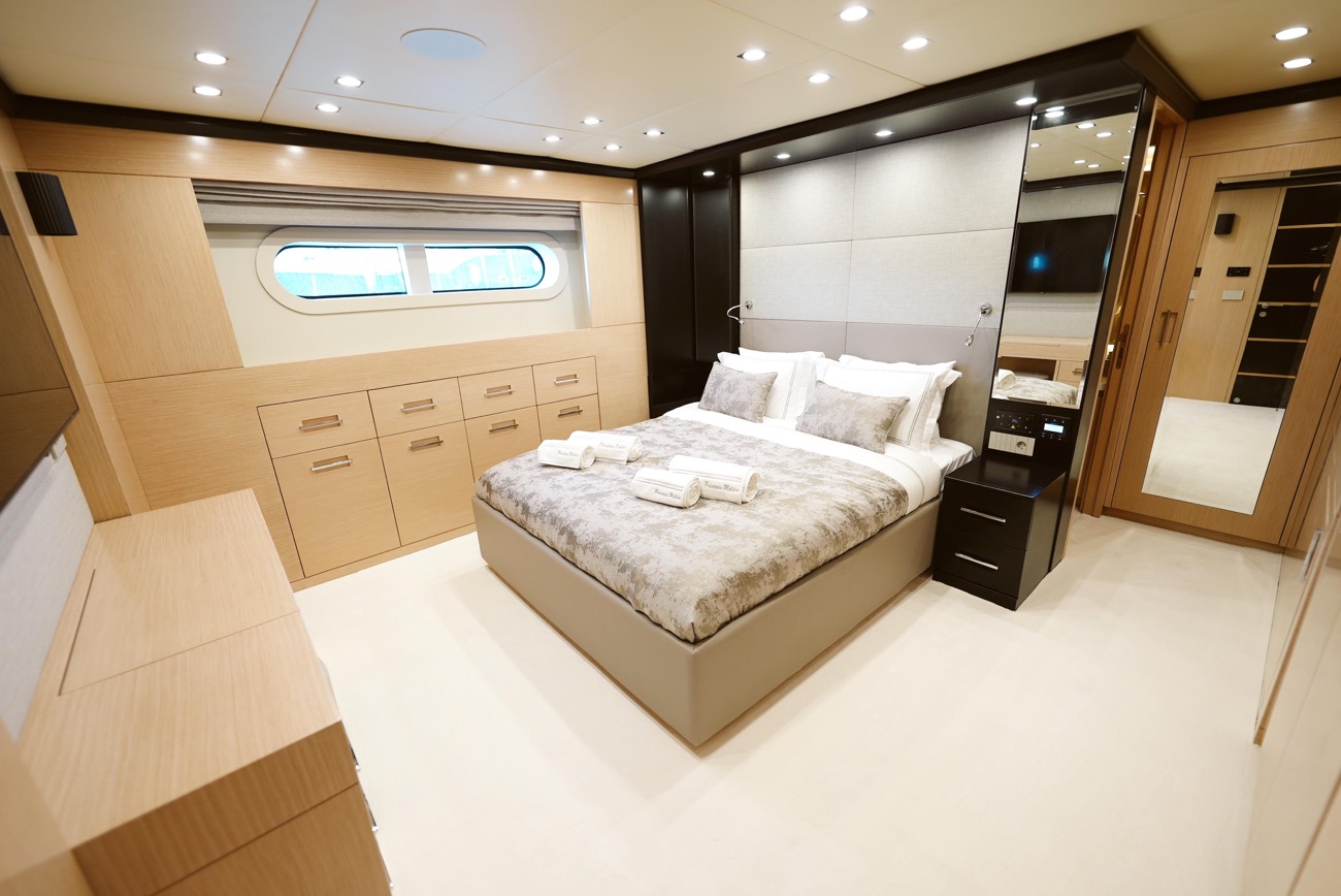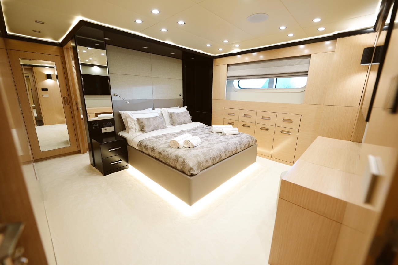 Özenle dekore edilmiş master kabininde giyinme odası ve makyaj masası bulunurken, kabinden teknenin iki jakuzisinden birine doğrudan erişim mümkündür.