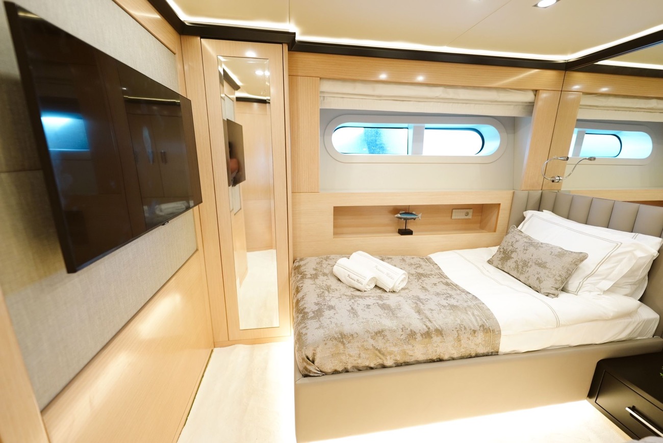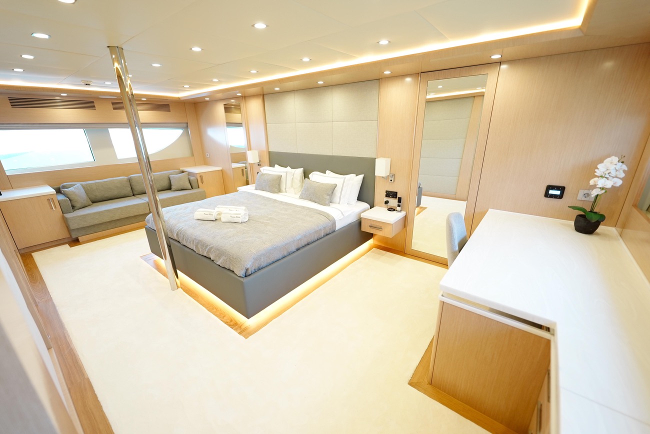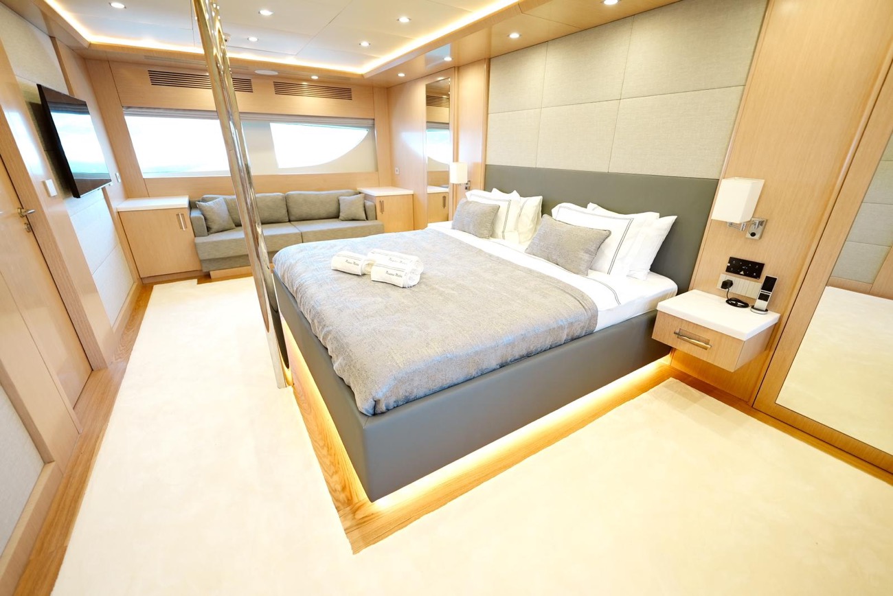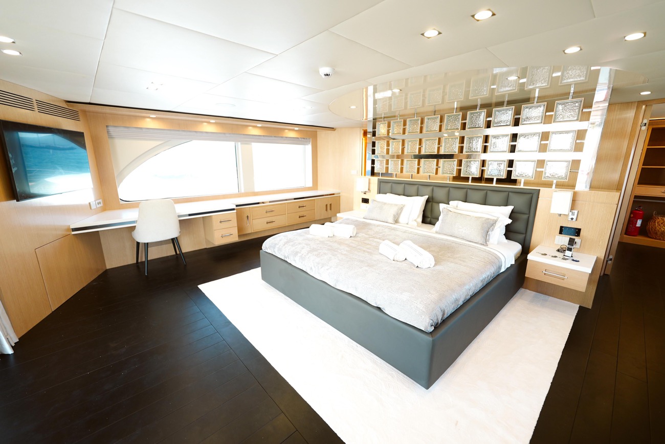 Özenle dekore edilmiş master kabininde giyinme odası ve makyaj masası bulunurken, kabinden teknenin iki jakuzisinden birine doğrudan erişim mümkündür.