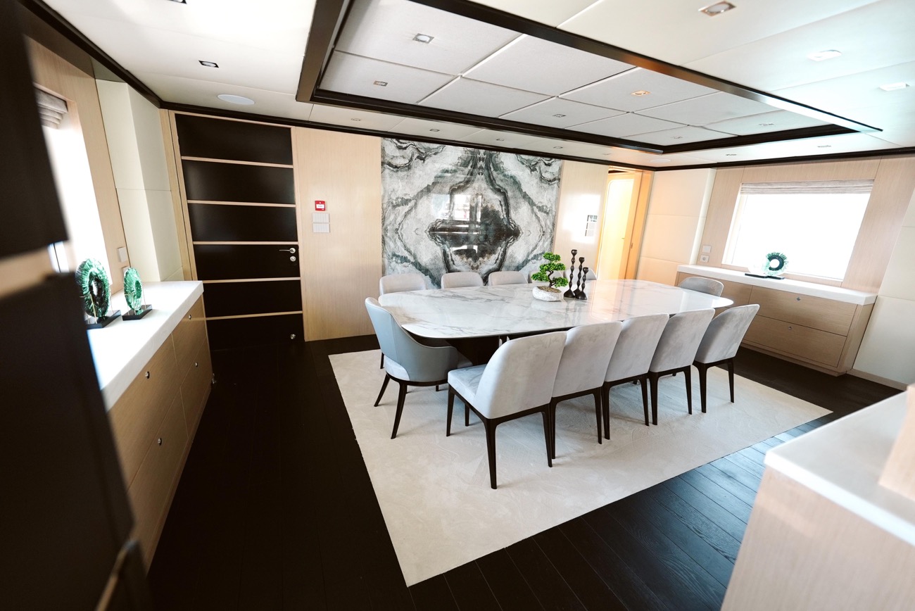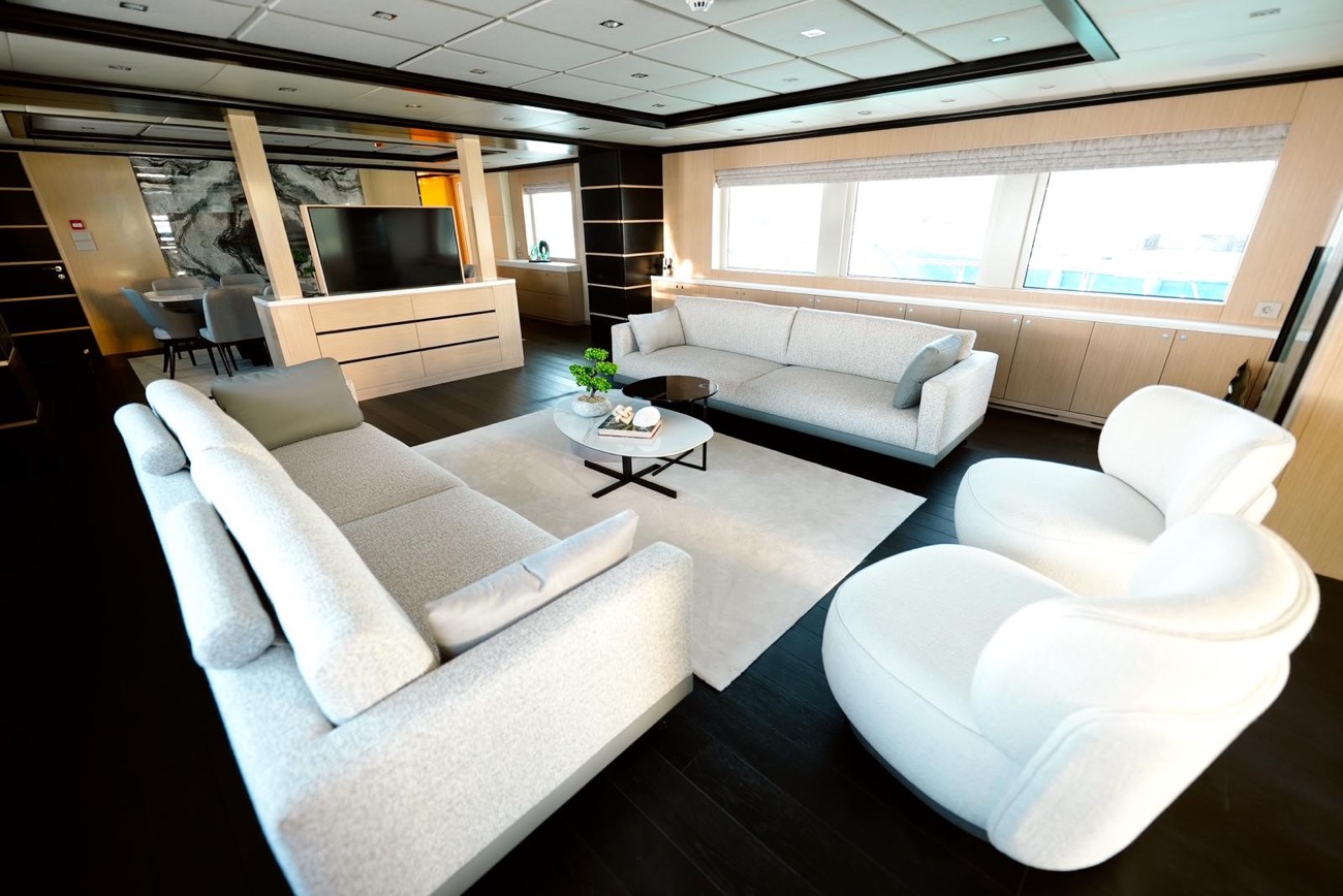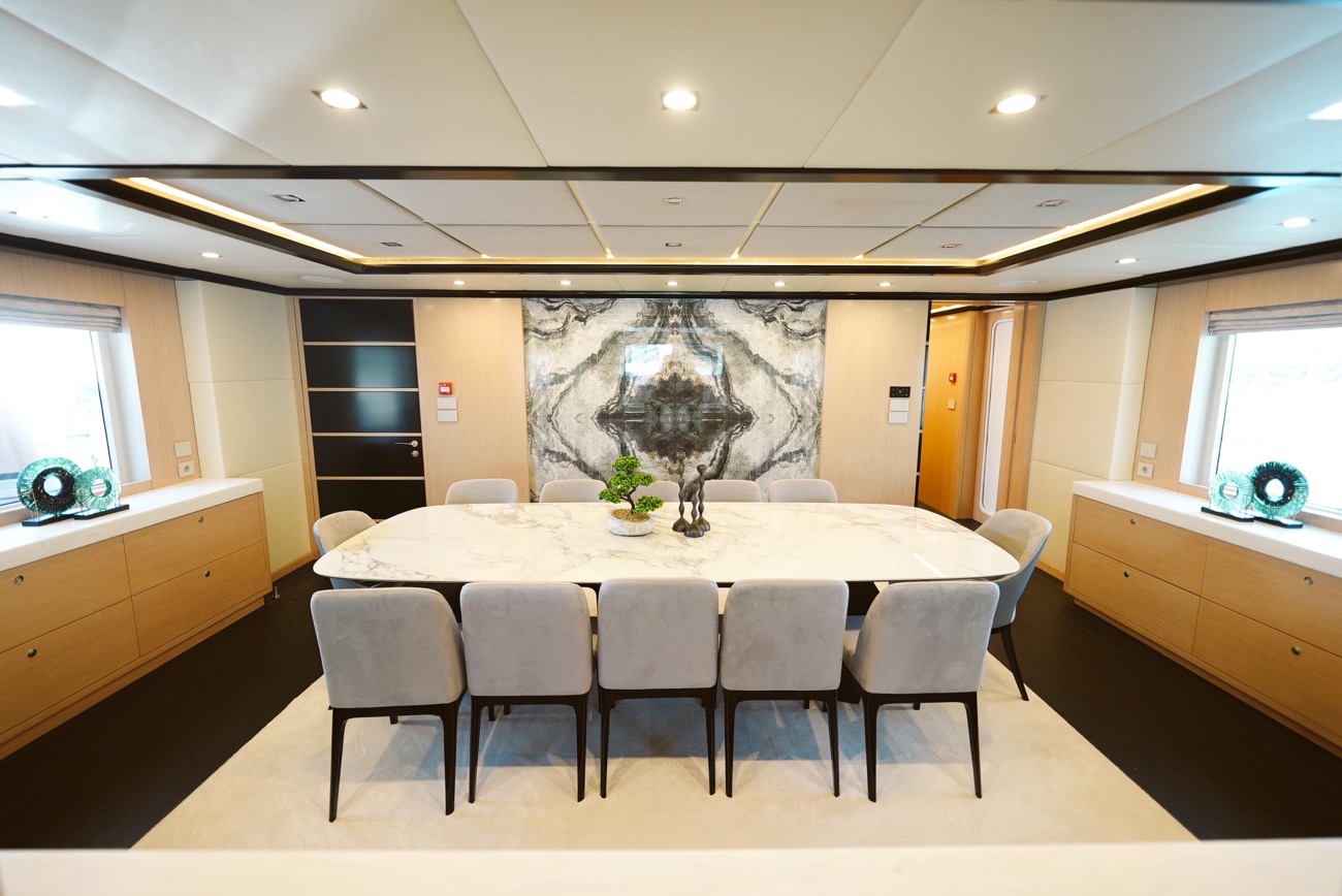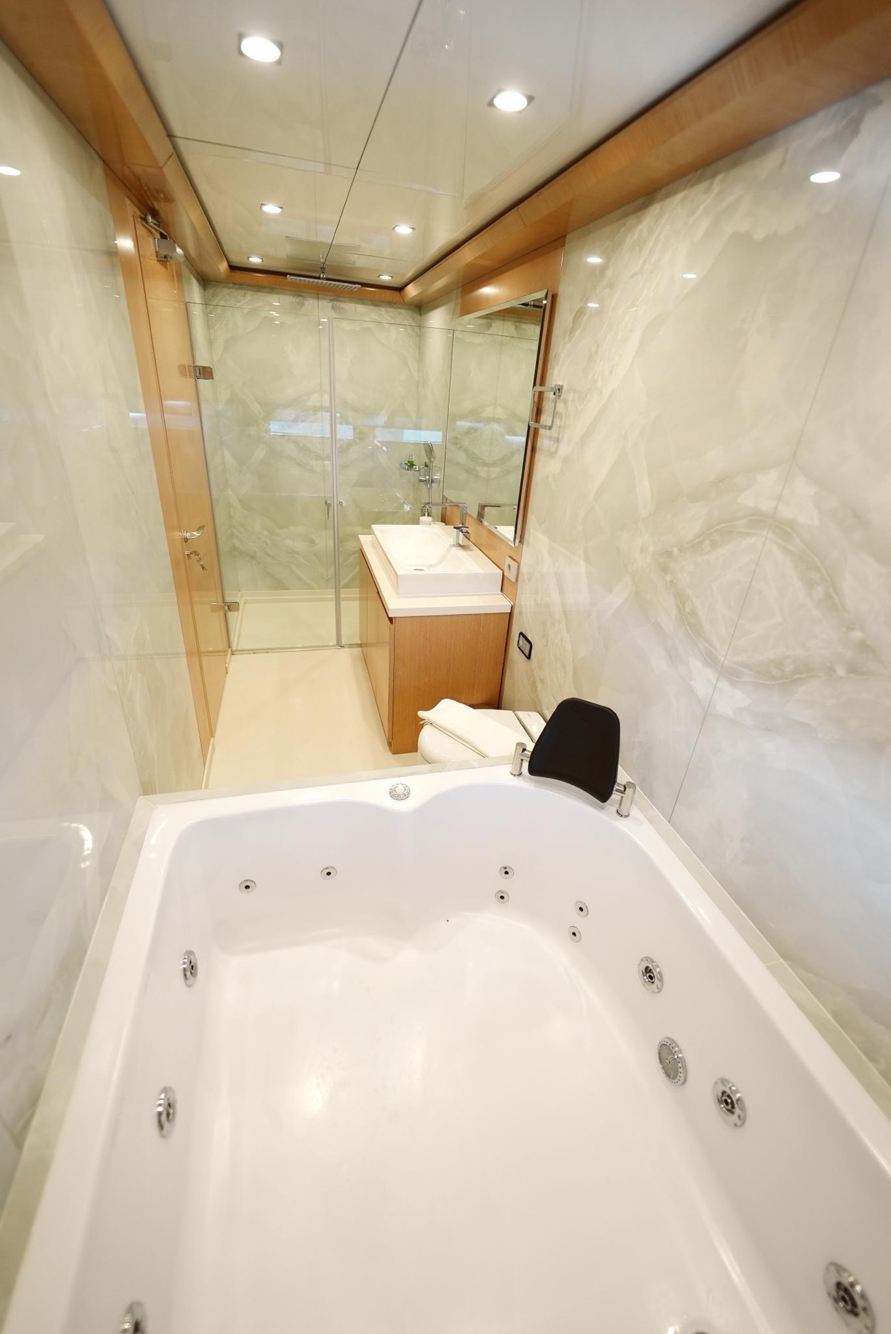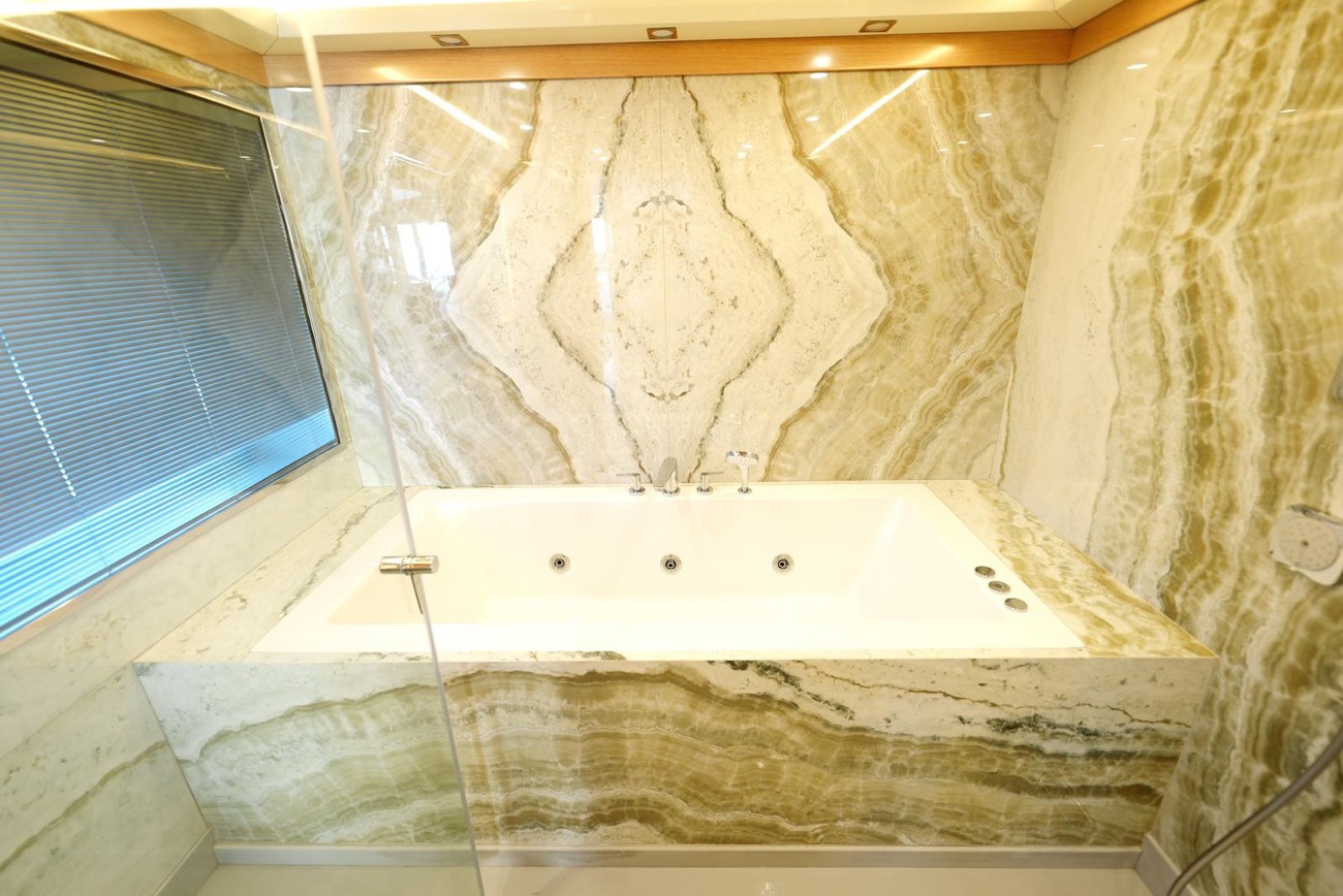 Özenle dekore edilmiş master kabininde giyinme odası ve makyaj masası bulunurken, kabinden teknenin iki jakuzisinden birine doğrudan erişim mümkündür.