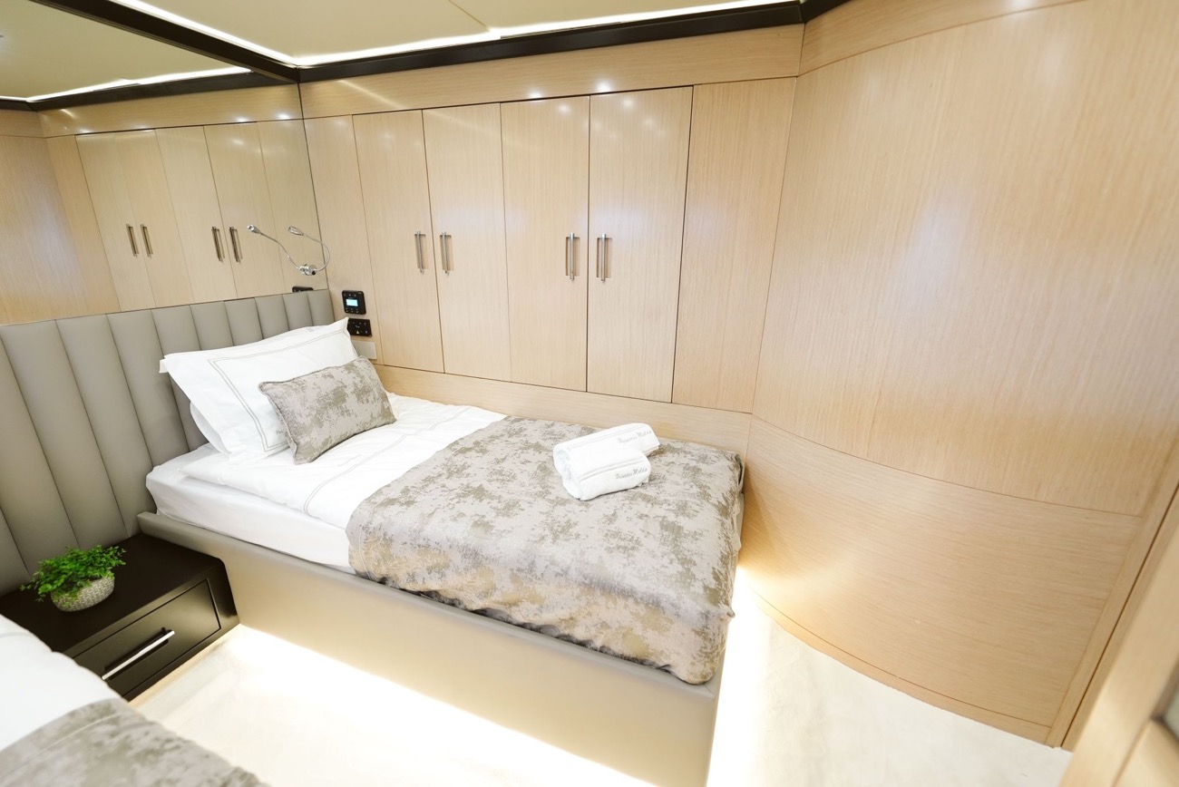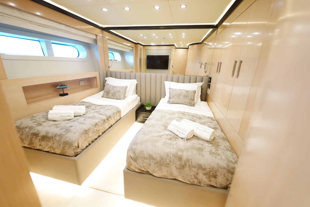 Toplam 6 geniş kabininde (2 master, 2 double ve 2 twin), 12 kişiye kadar konaklama imkânı sunan Princess Melda, zarafetle tasarlanmış iç mekânları ve ferah yaşam alanlarıyla denizde konforu yeniden tanımlar.