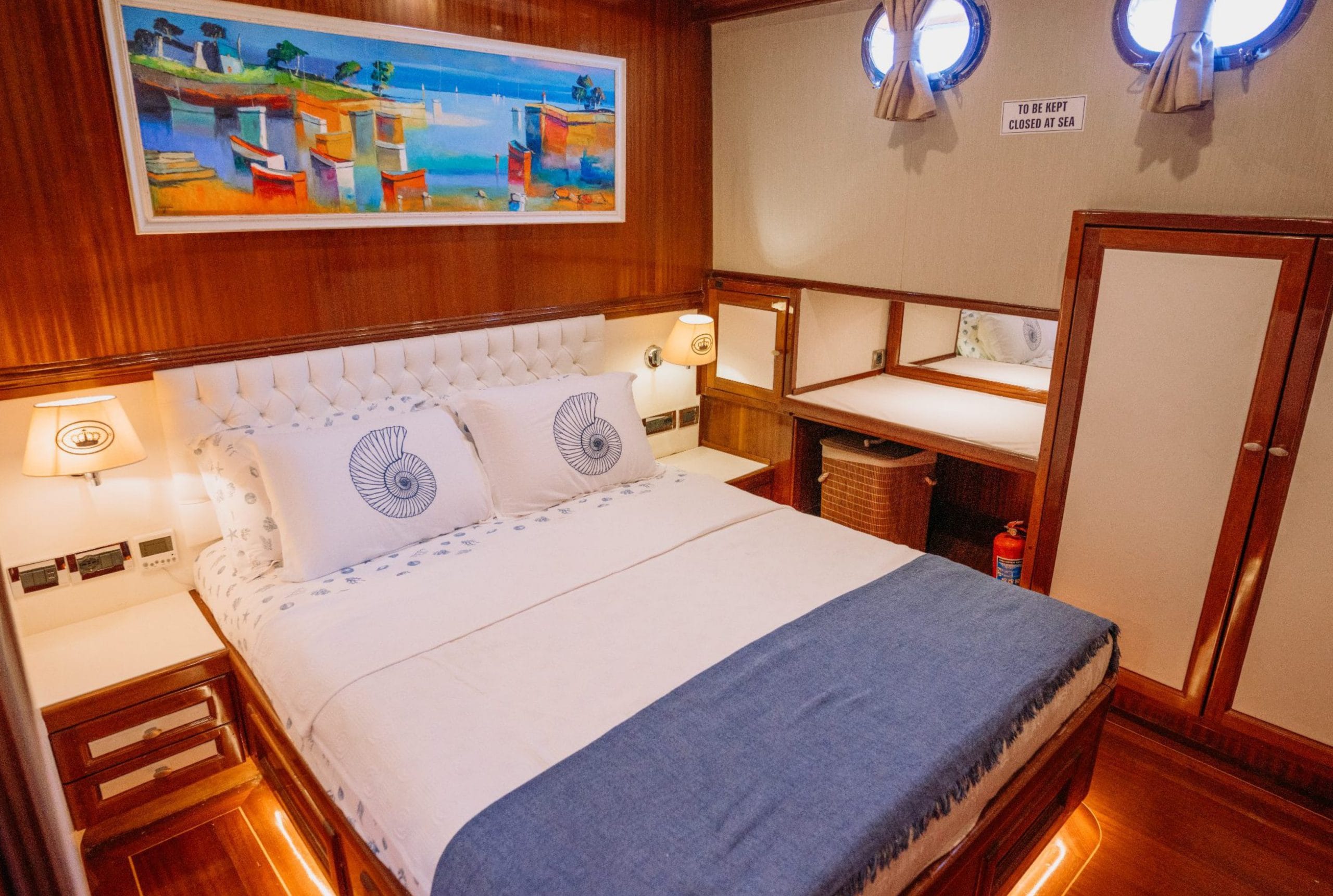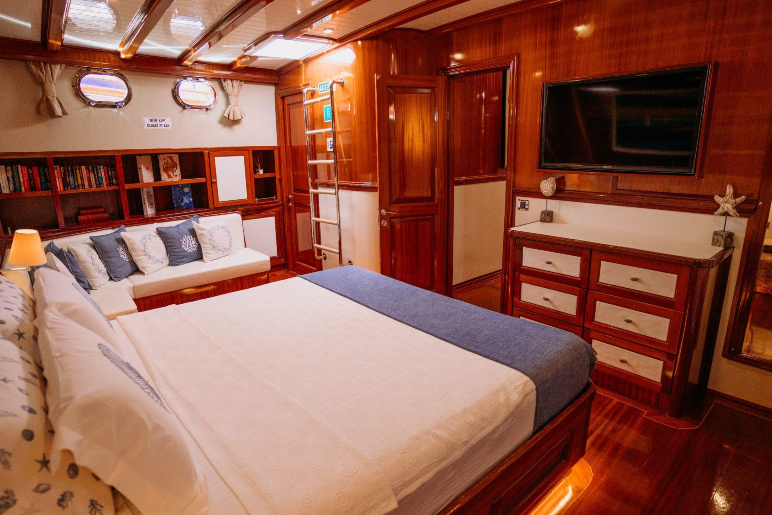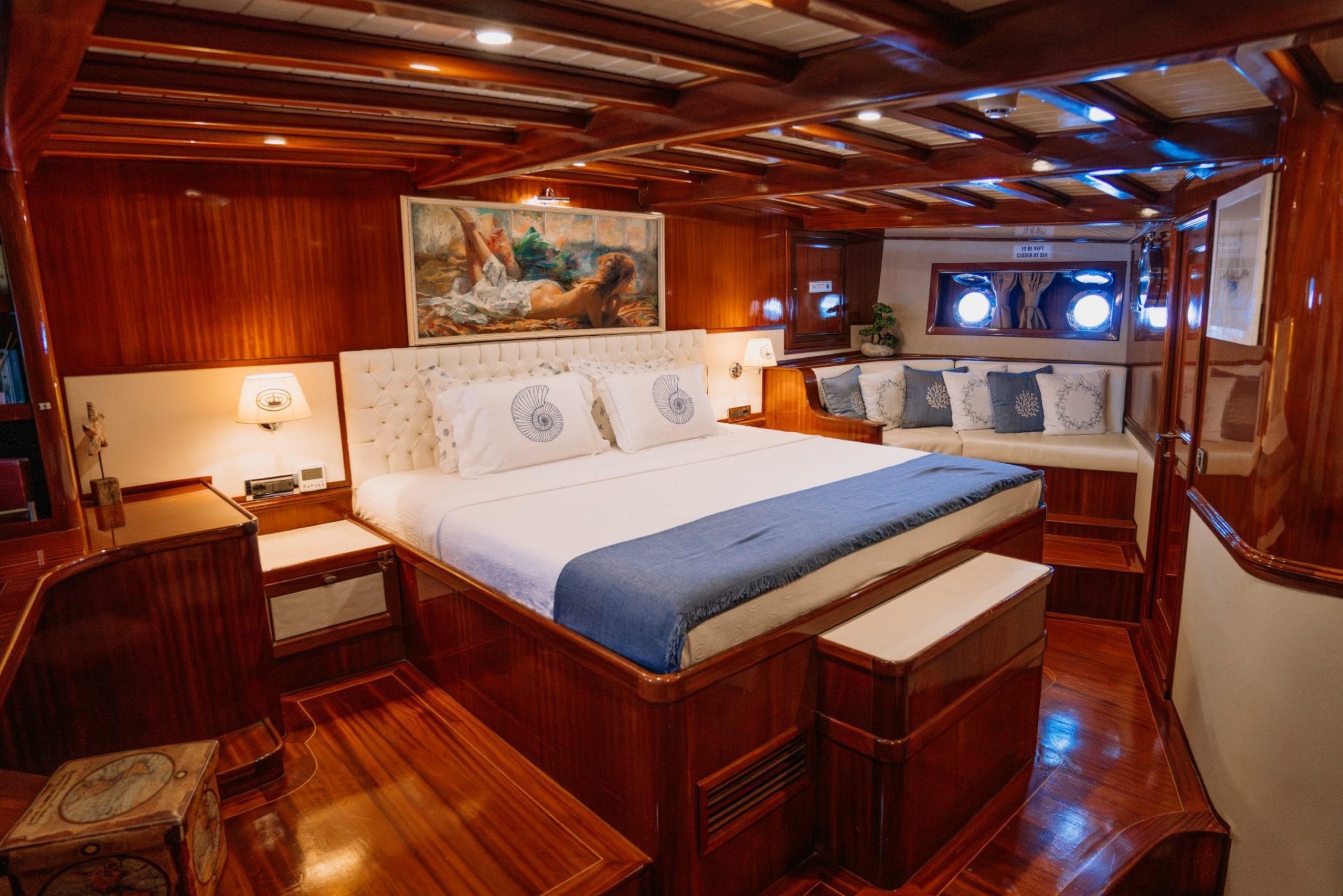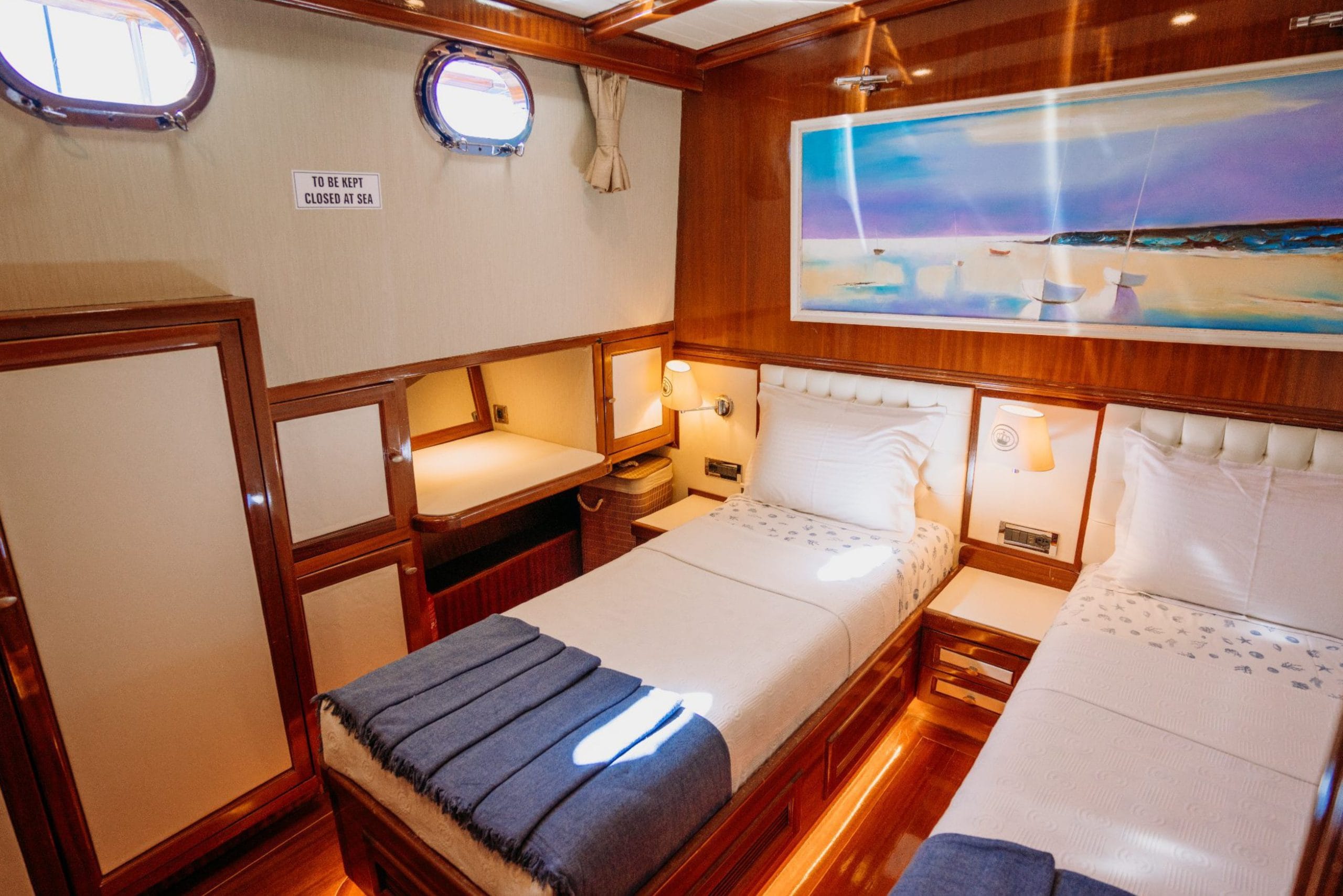 Gulette yer alan 5 konforlu kabin, toplam 10 misafire kadar lüks konaklama imkânı sunar. Her kabin, zarif detayları, konforlu yatakları ve klima donanımıyla misafirlerine huzurlu bir atmosfer sağlar.