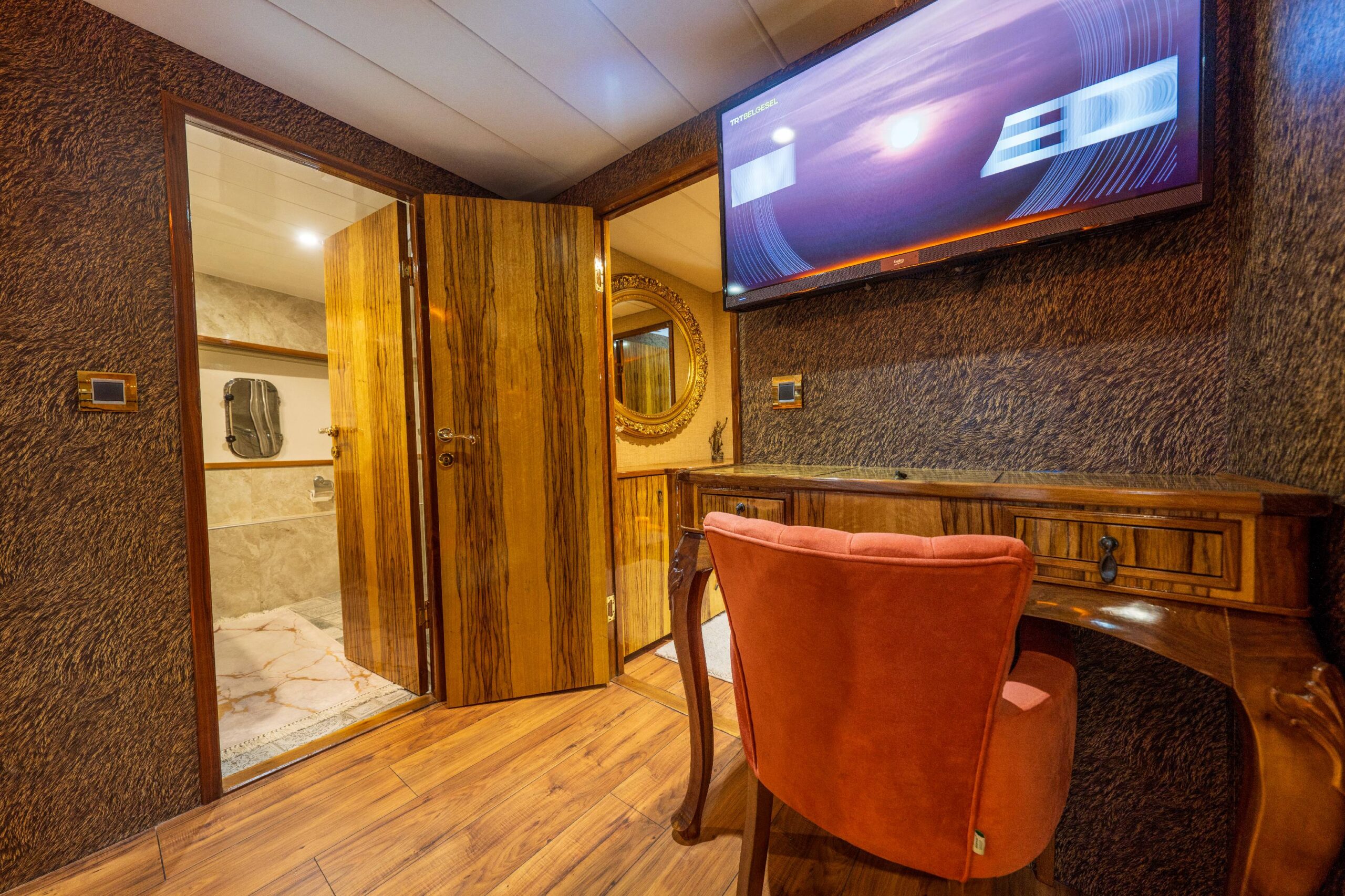 Her kabinde ve salonda LCD TV, müzik sistemi, ayrıca 3 kabinde minibar yer almaktadır. 2022 yılında yapılan yenileme çalışmaları kapsamında teknemizin halıları kaldırılmış, yerine şık ahşap zemin kaplaması uygulanmış; tüm döşemeler ve dış boya tamamen yenilenmiştir.