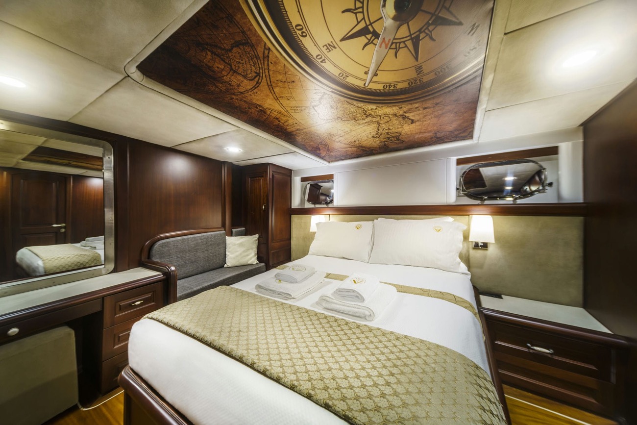 Virtuoso Gulet, 34,60 metre uzunluğu, 6 zarif kabini ve 12 kişilik konuk kapasitesiyle modern konforu geleneksel ahşap işçiliğiyle buluşturan özel bir yat deneyimi sunar.